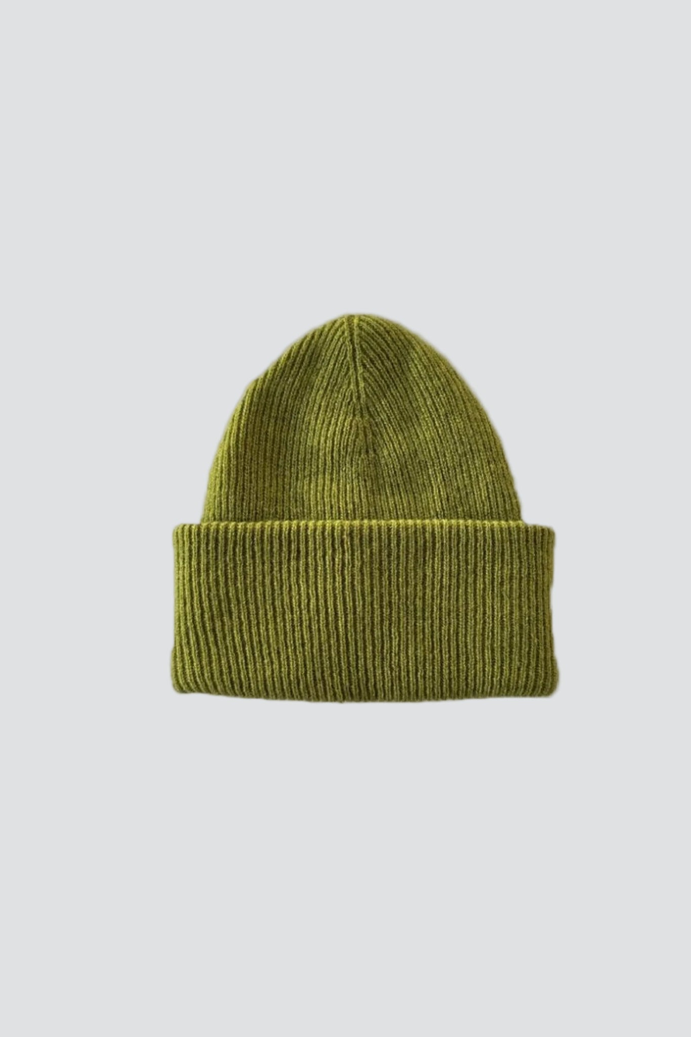 Thick ribbed knit beanie in a cozy wool knit with a fuzzy texture.