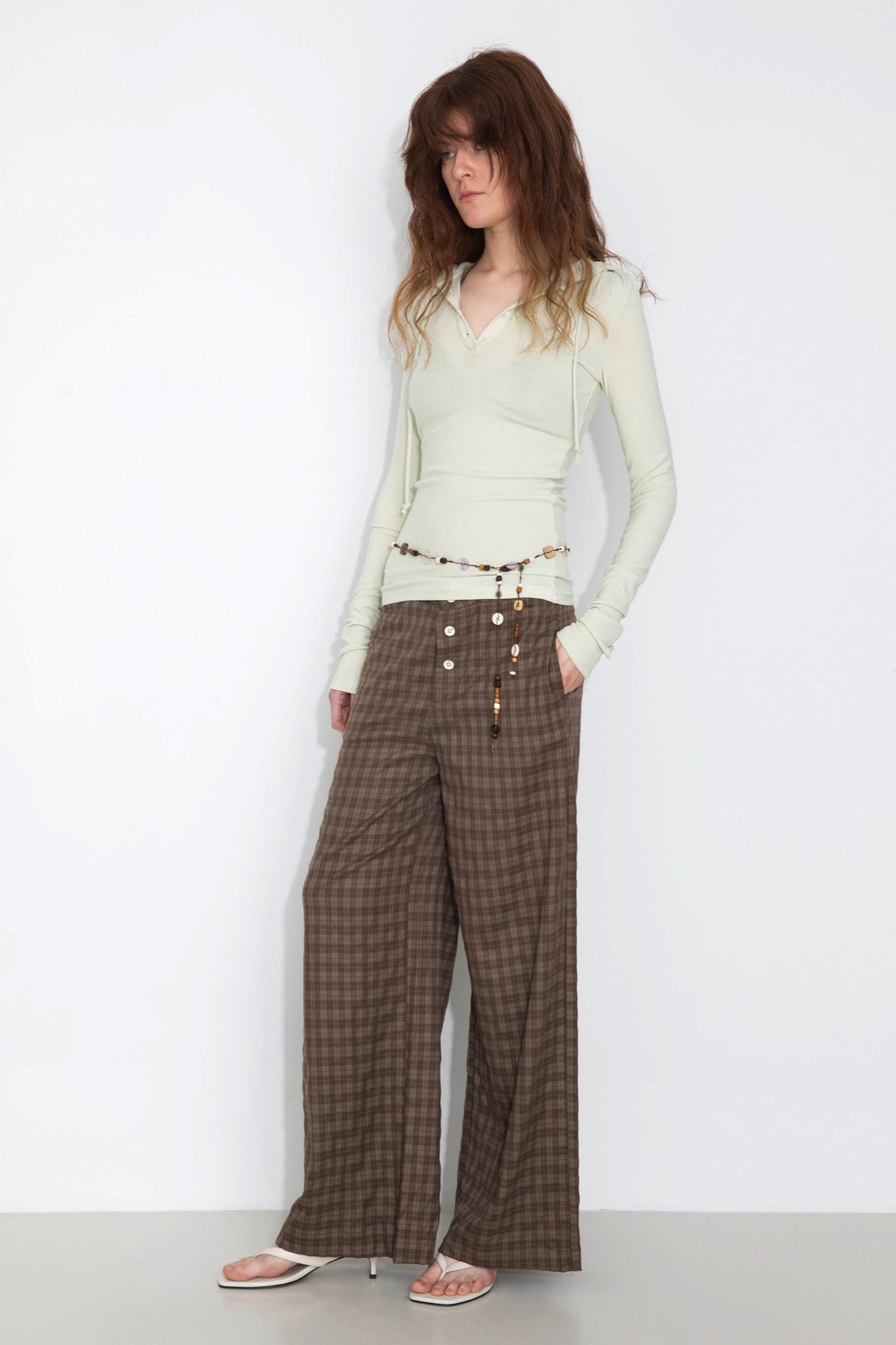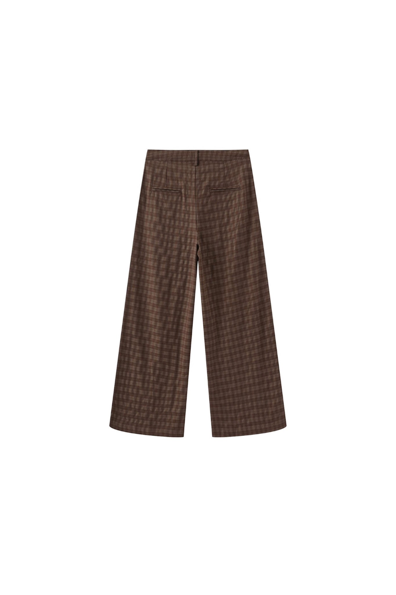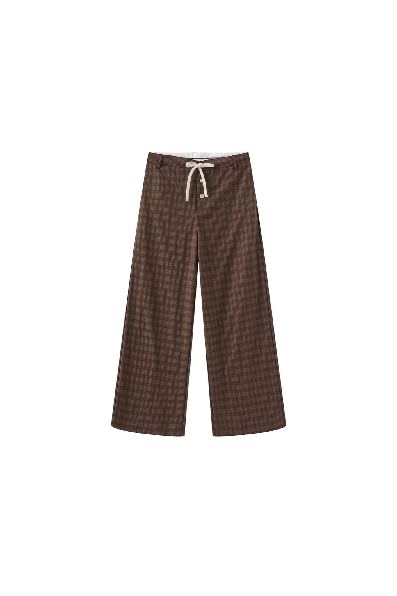 Wide-Leg casual pants in coffee and navy. Features a relaxed, floor-length silhouette with an adjustable drawstring waistband. Classic plaid pattern with two side slash pockets.