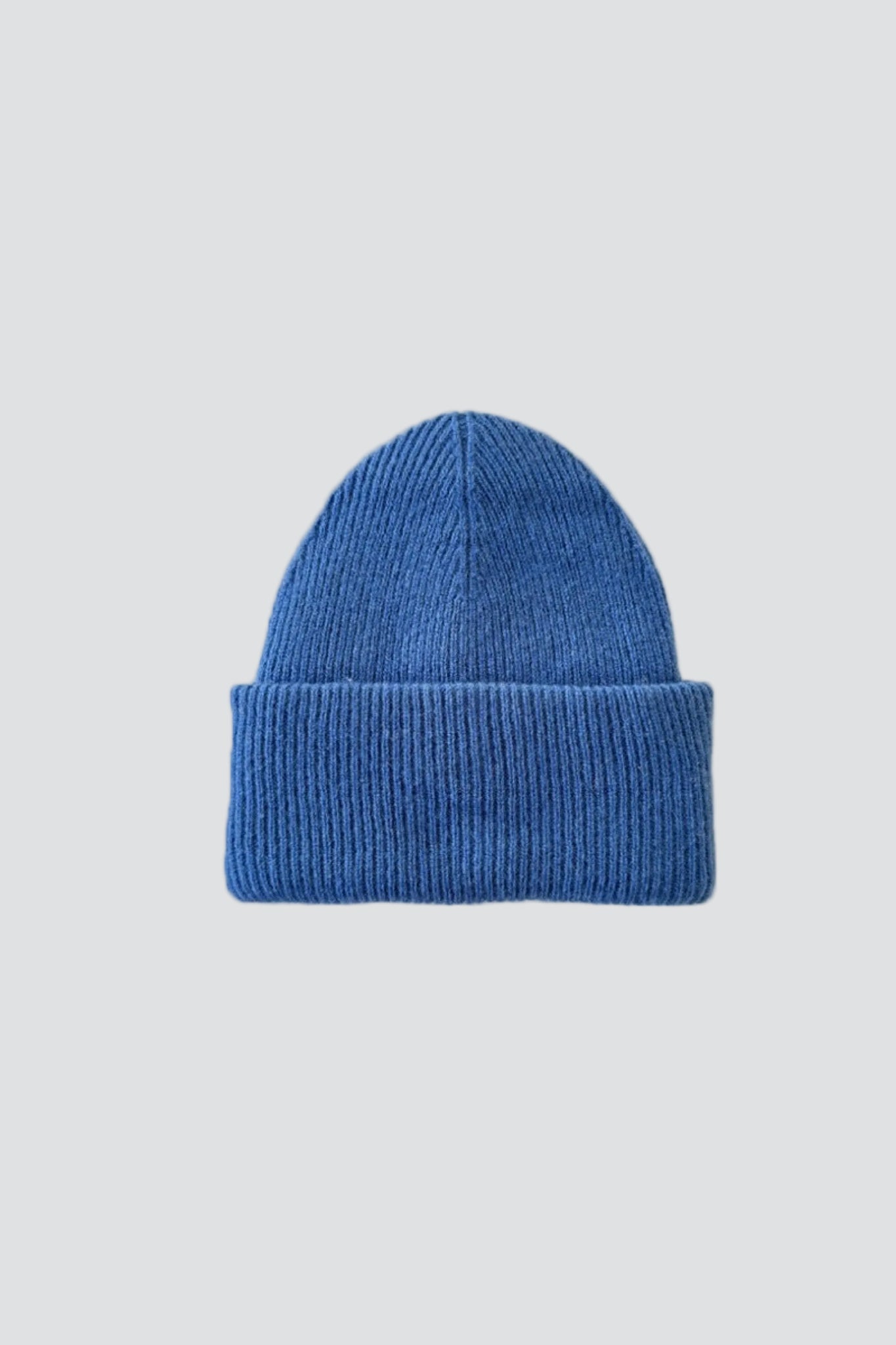 Thick ribbed knit beanie in a cozy wool knit with a fuzzy texture.