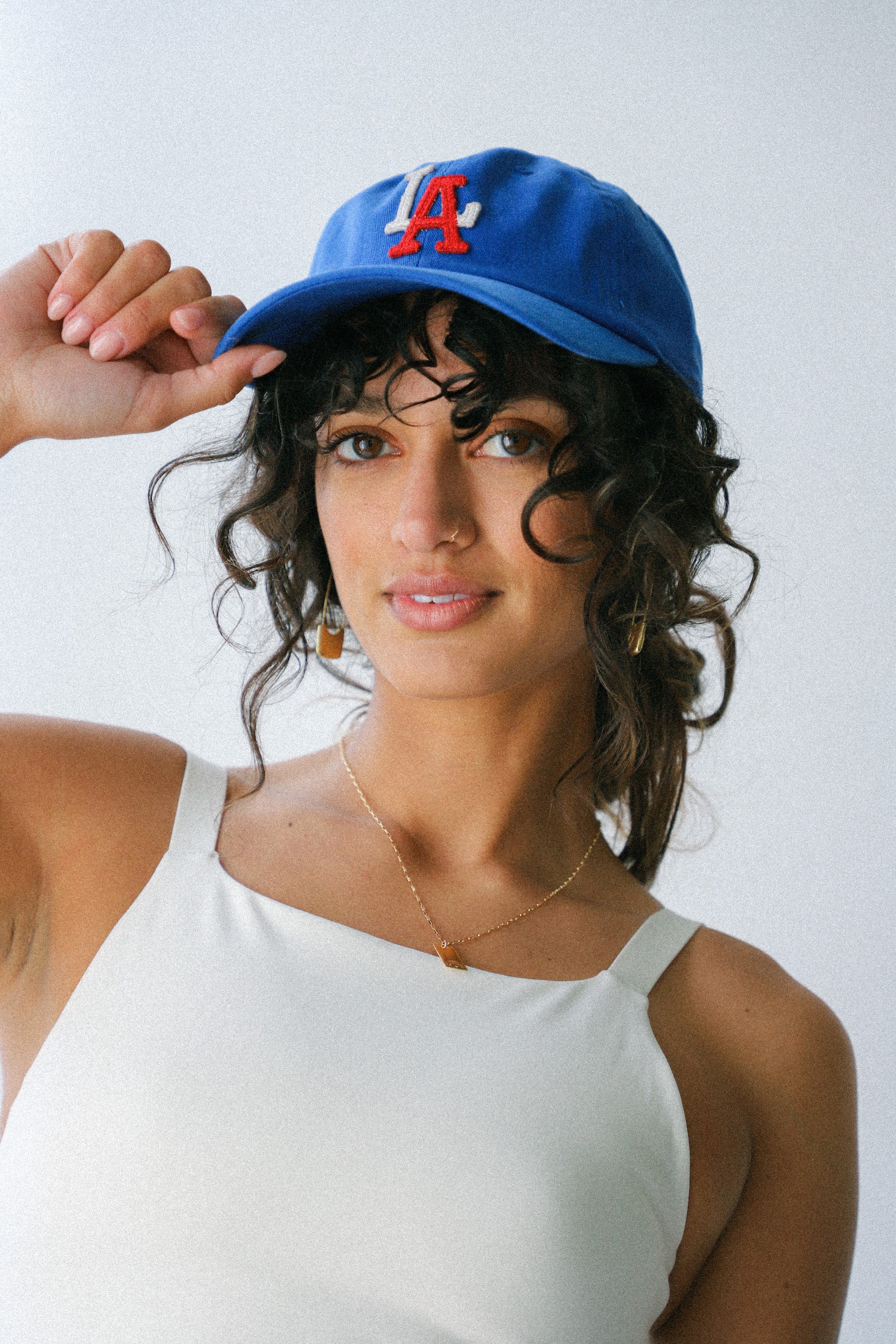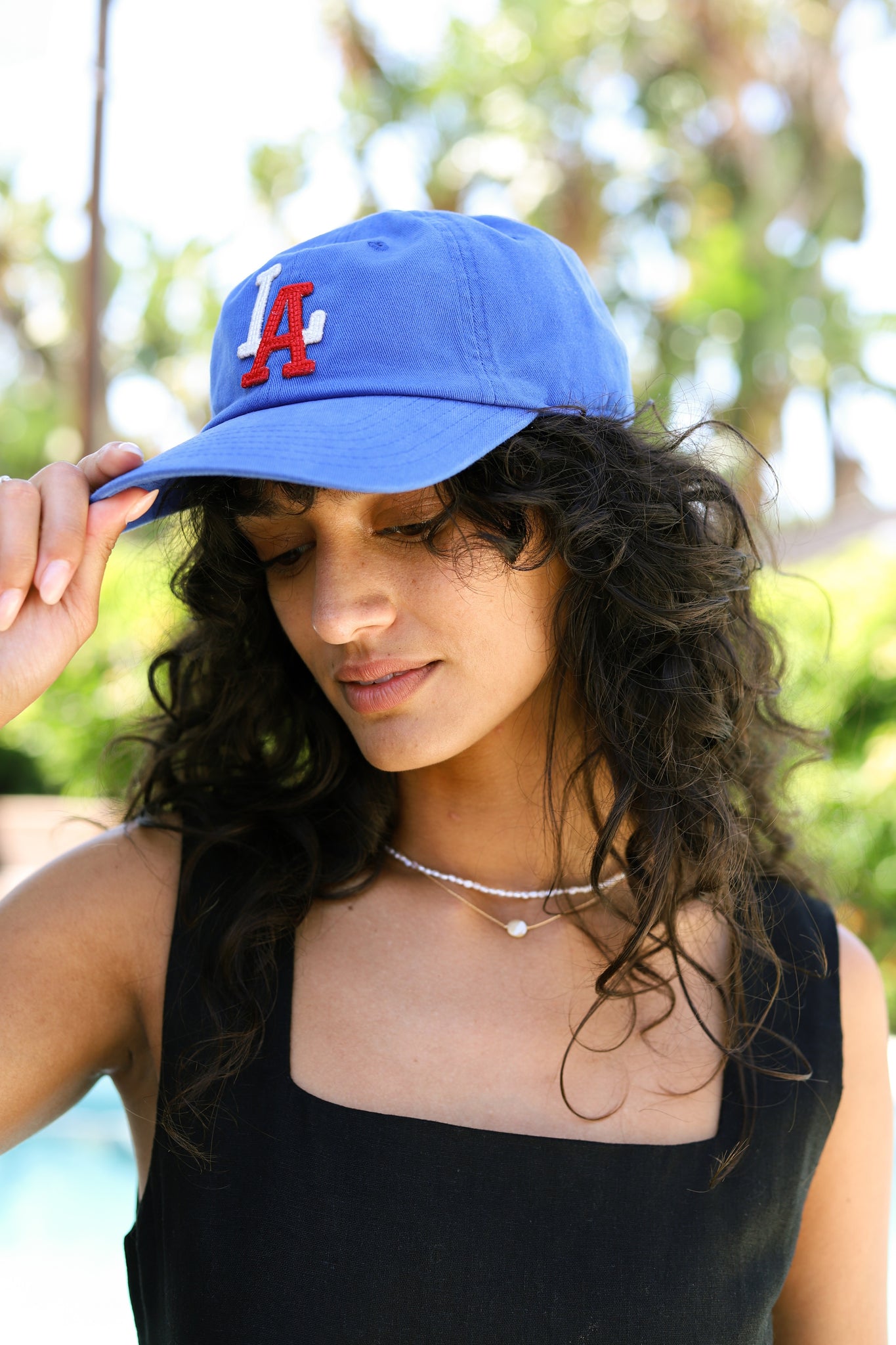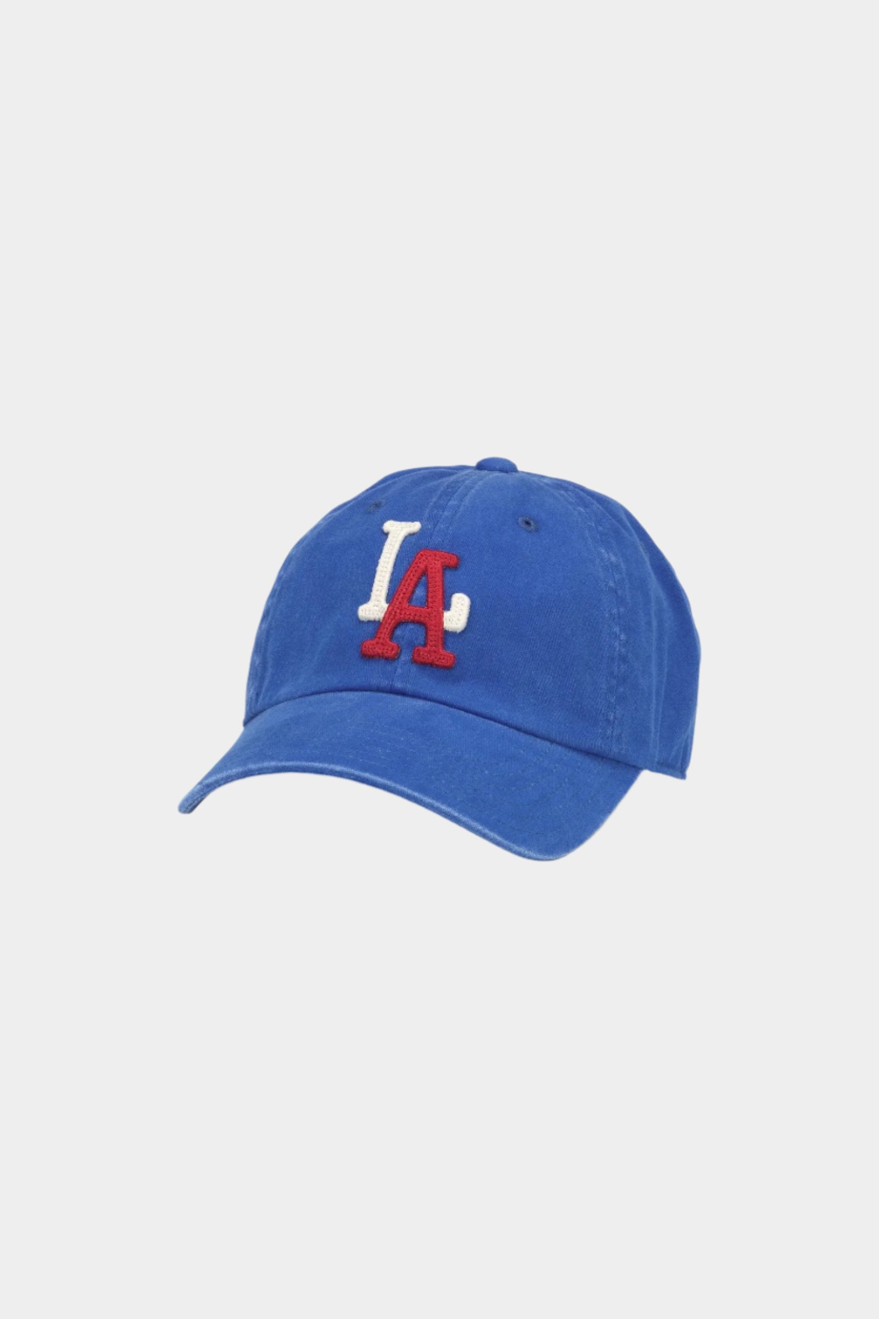 Vintage washed cap featuring a retro LA embroidered logo and an adjustable back strap with a vintage brass buckle.