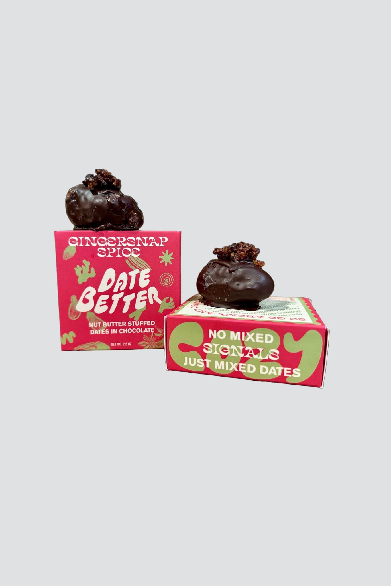 Gingersnap Spice – Holiday Almond-Cashew Butter–Stuffed Chocolate Dates The winter treat shoppers have been hunting for. Warm ginger, cinnamon, and holiday baking spices swirl into a creamy blend of almond and cashew butters, hand-stuffed inside soft Medjool dates. Each bite is dipped in rich dark chocolate and finished with that nostalgic, cozy-cookie flavor — but in a clean-label, better-for-you form.