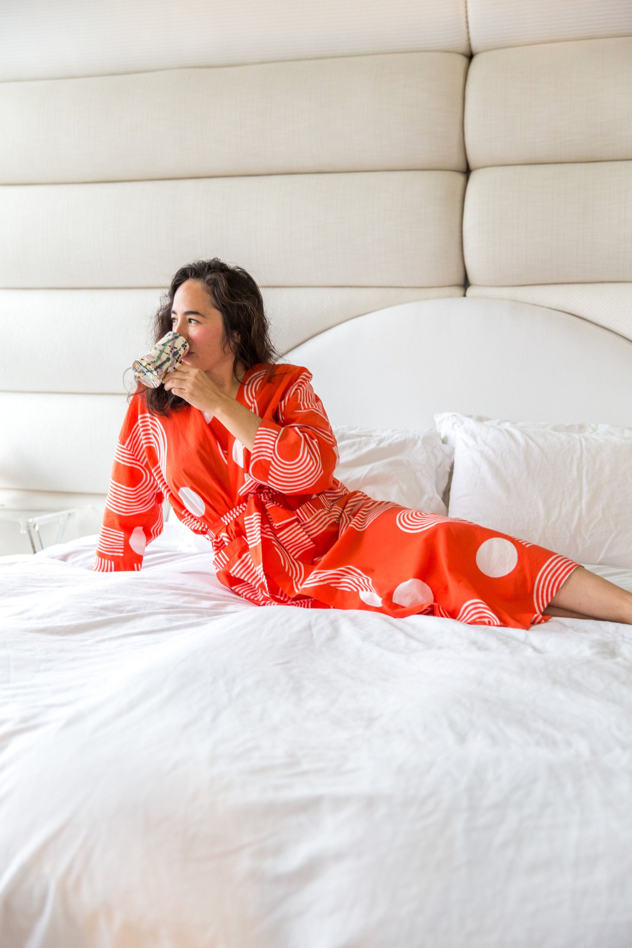 An instant mood-enhancer. Our signature Sidewinder design block printed in brilliant poppy and bright white on super lightweight organic cotton. Oversized, deep pockets for your phone / kid's bottle / pet hedgehog while you're making coffee.