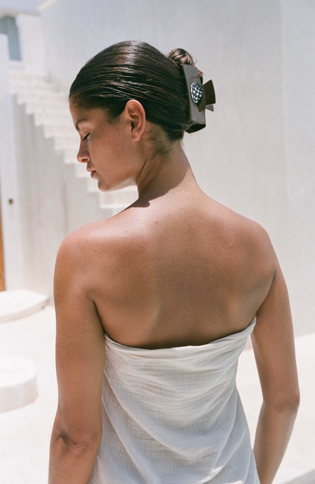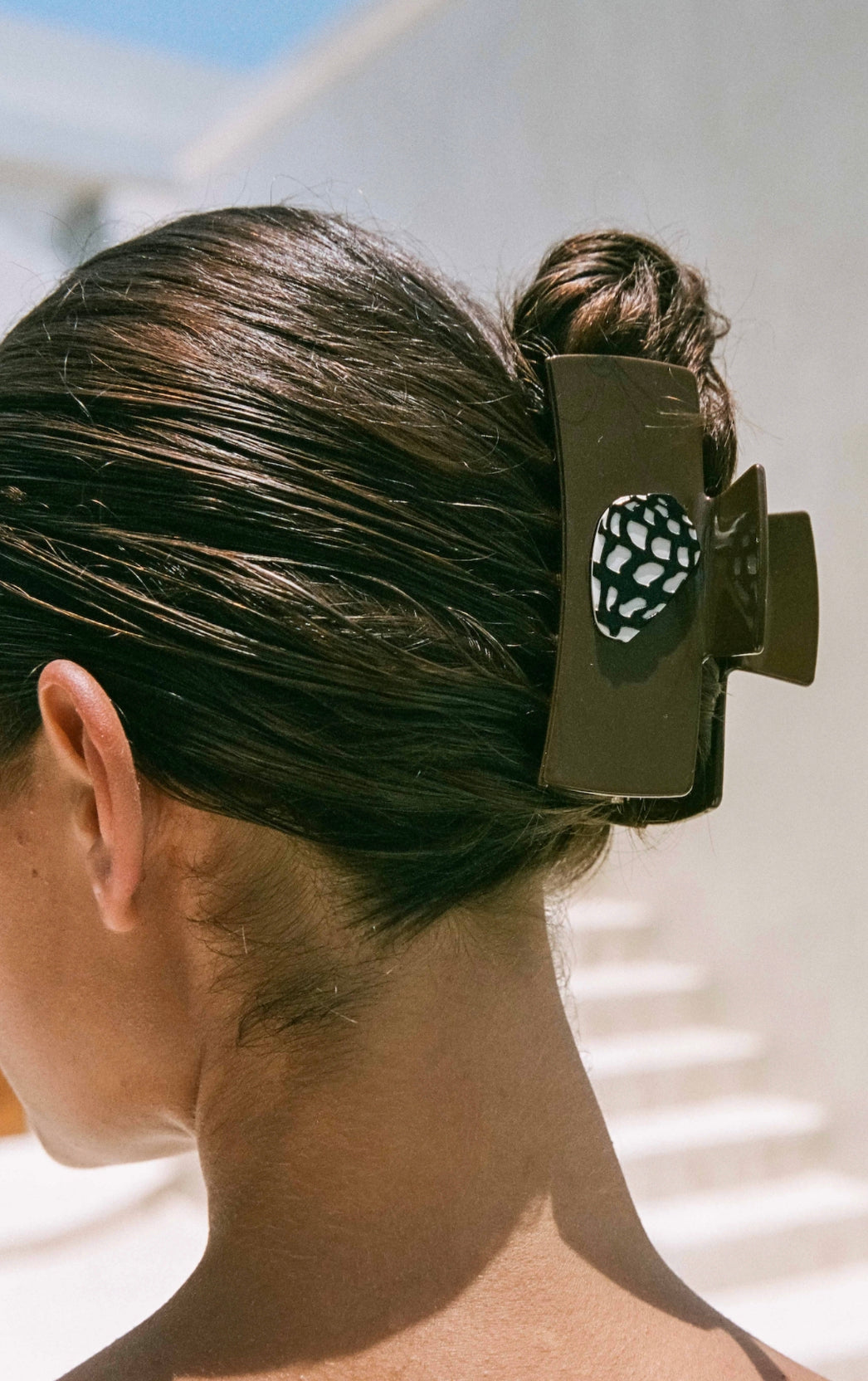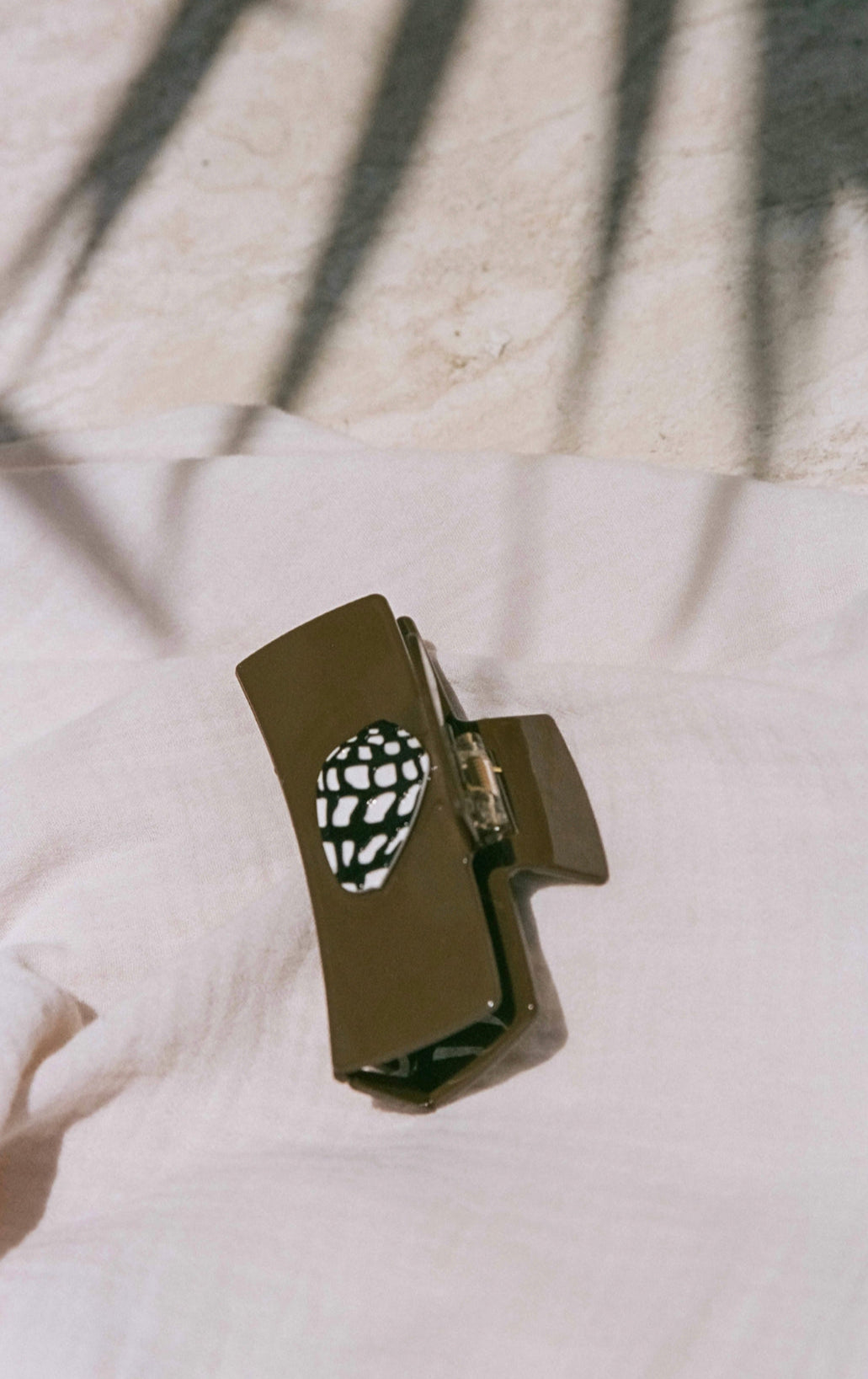 This solid clip is a must-have for anyone who loves to add understated elegance to their look. Available in Iridescent yellow: a high shine stone with yellow floral inlay