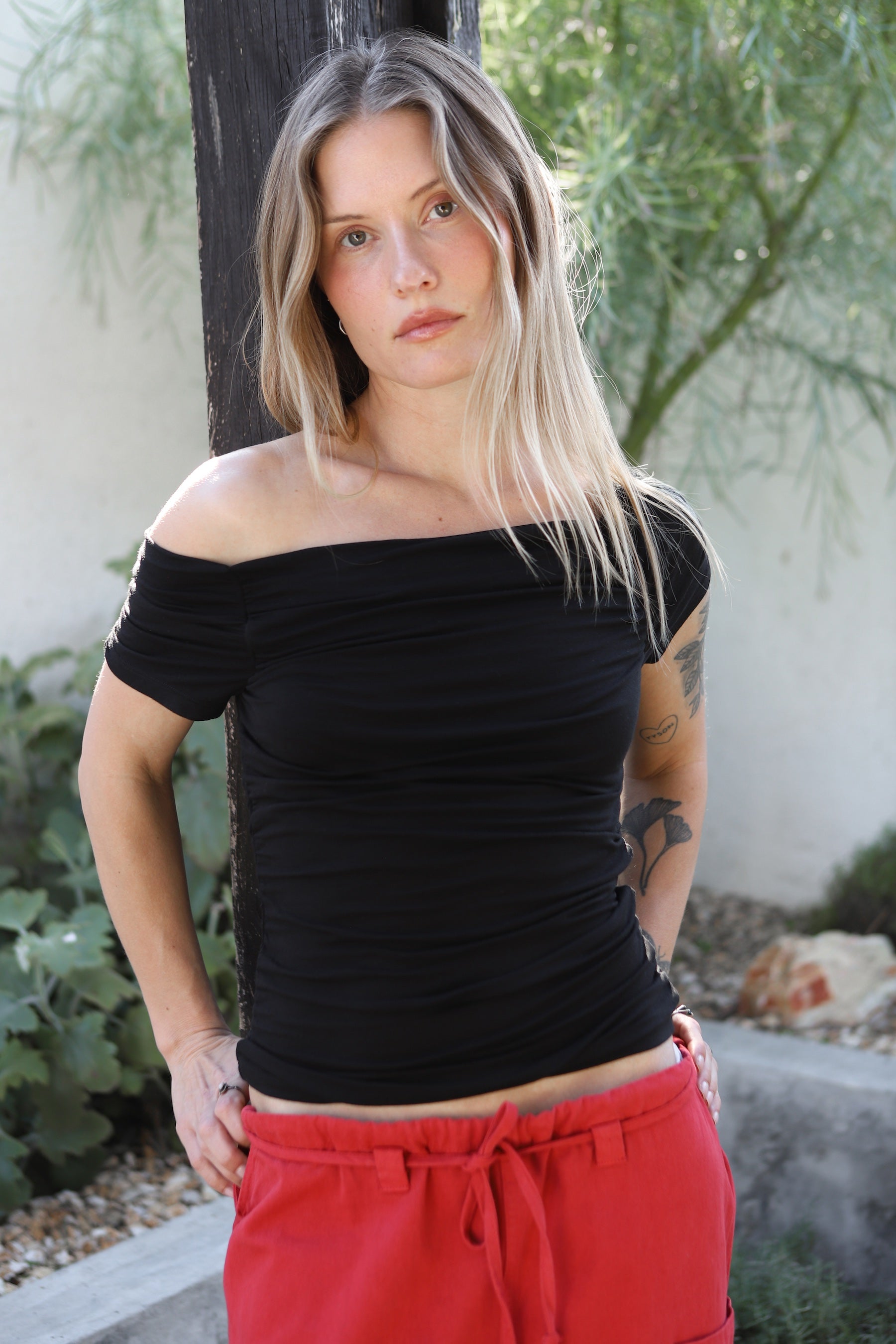 Say hello to your new obsession. The Black Halle Top is basically the little black dress's cooler, more relaxed cousin. With its flirty off-the-shoulder neckline and a waist-cinching detail that actually makes you feel amazing.