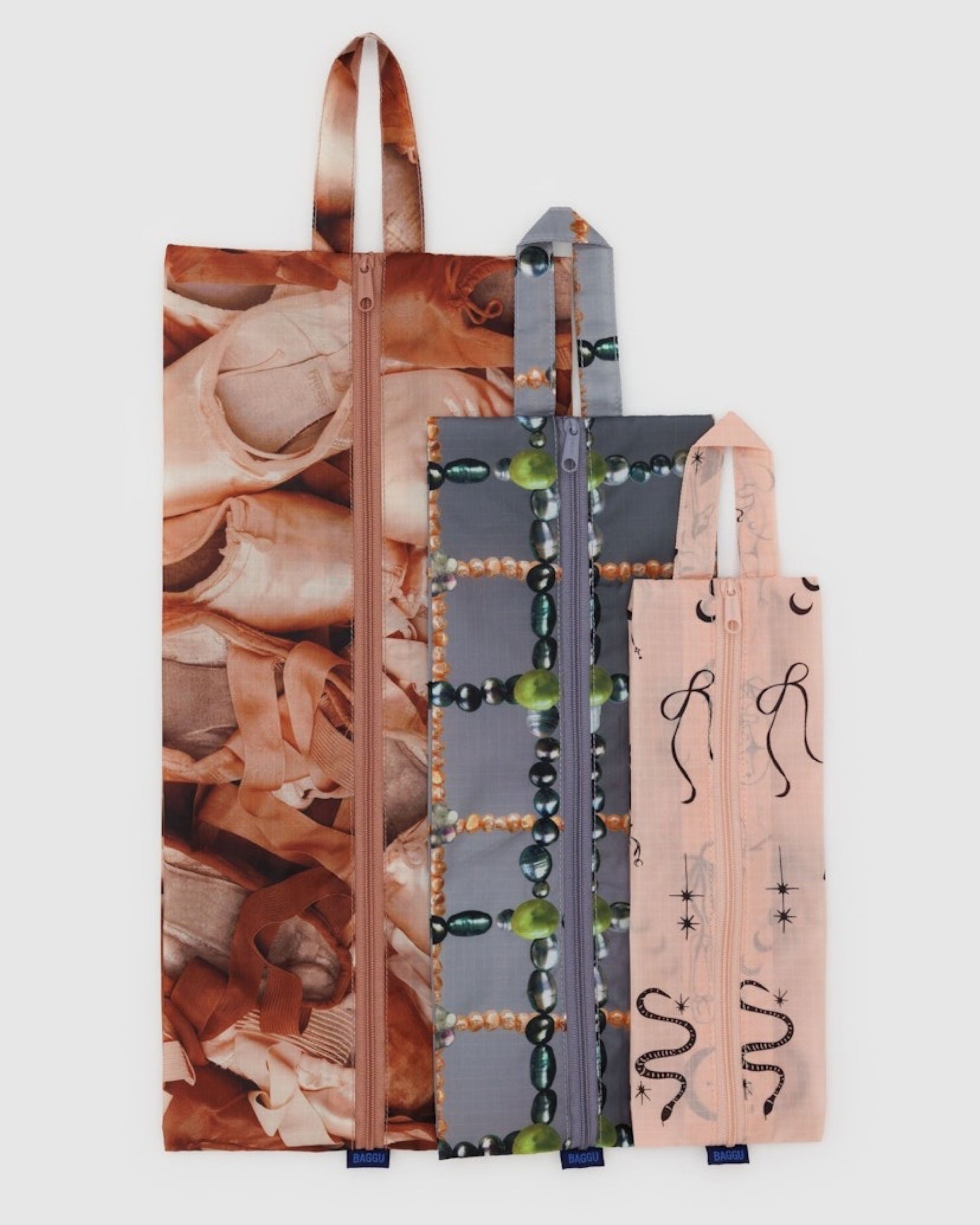 A set of three zippered pouches for travel and organization, with loops for carrying and hanging on the go. Perfect for packing, organizing your bag, or home tidying.