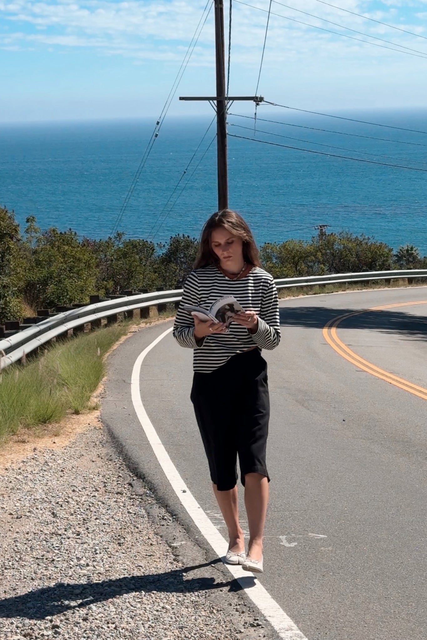 The Liam Shorts offer a modern twist on the classic Bermuda. They feature an elasticated waistband for comfort, side seam pockets, and a relaxed fit with slightly flared panels for added shape. The elongated inseam and subtle A-line silhouette make them easy to wear from day to night.