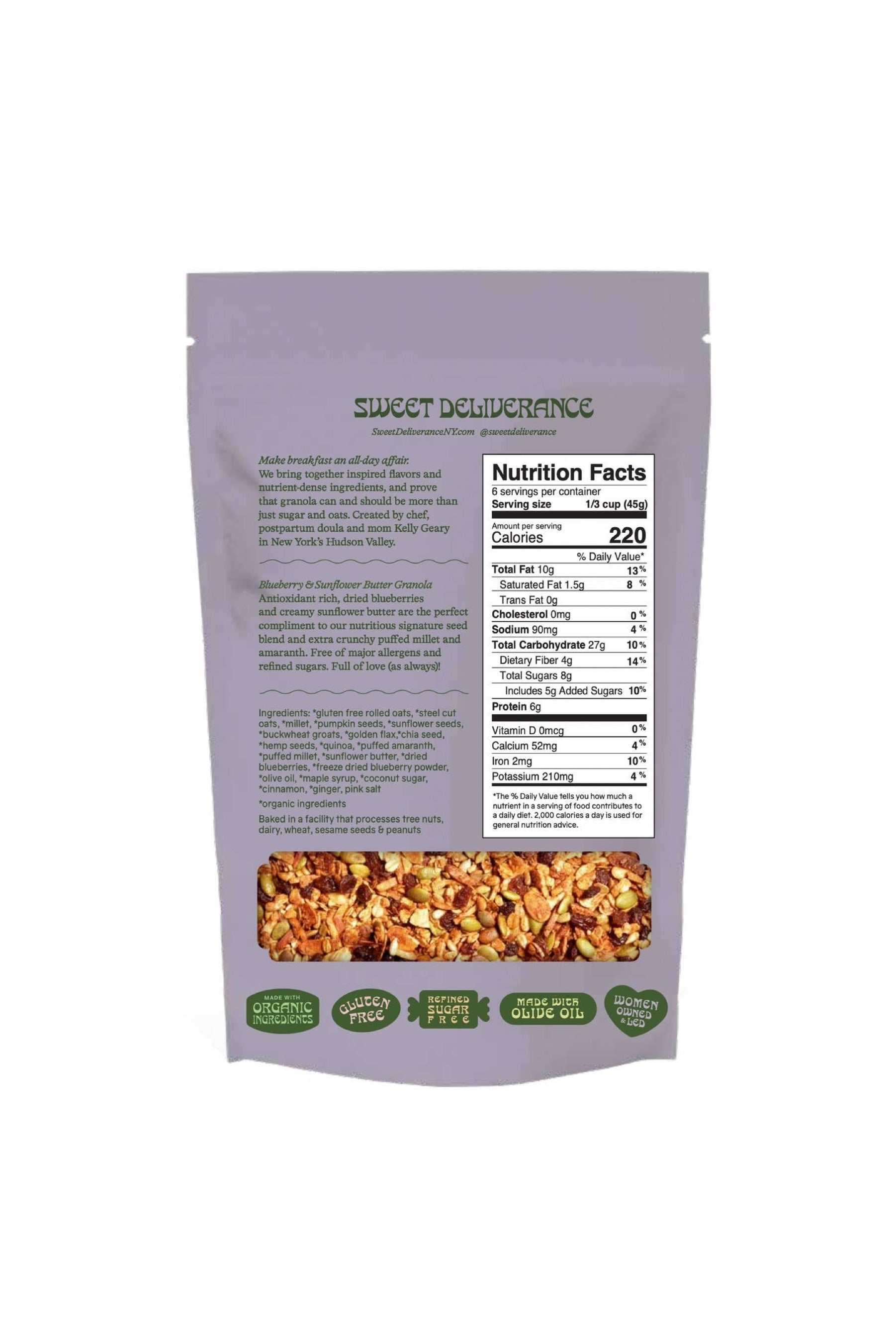 Ingredients: Organic Steel Cut Oats, Organic Rolled Oats, Buckwheat Groats, Millet, Flax Seed, Amaranth, Chia Seed, Organic Coconut Sugar, Extra Virgin Olive Oil, Maple Syrup, Pink Salt, Sunflower Seeds, Pumpkin Seeds, Hemp, Quinoa, Organic Puffed Millet, Organic Puffed Amaranth, Organic Sunflower Butter, Organic Ginger, Organic Cinnamon, Organic Freeze-Dried Blueberry Powder, Dried Blueberries