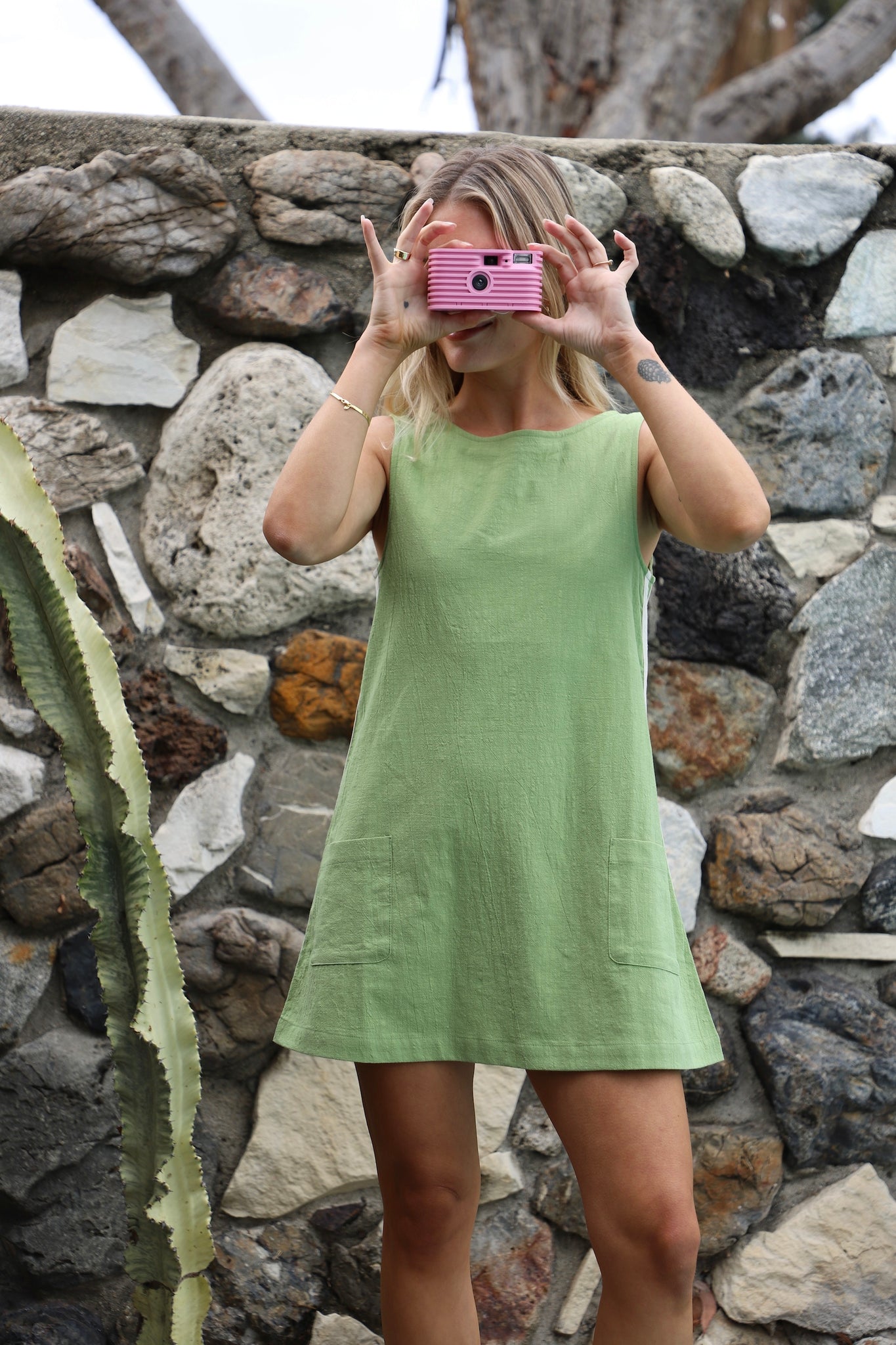A boxy, mini dress with a scoop back designed for easy, laid-back style in a fresh green hue.