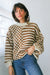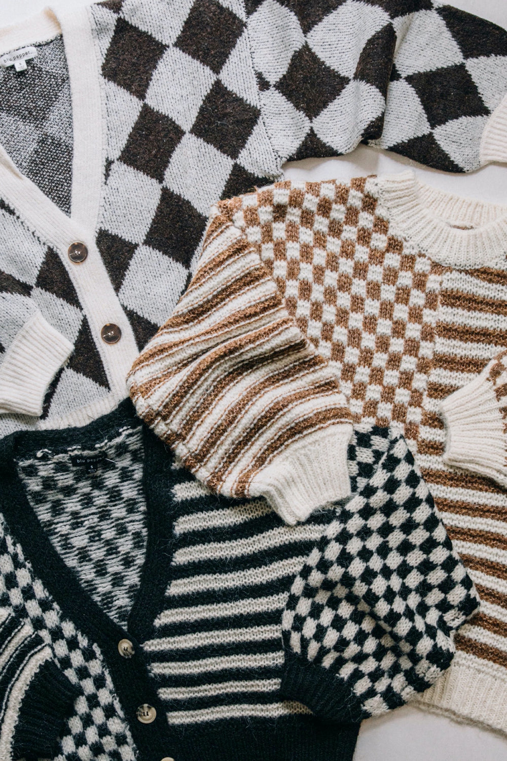 Knit pullover featuring an oversized balloon sleeve in a striped check pattern with a crewneck and boxy fit.