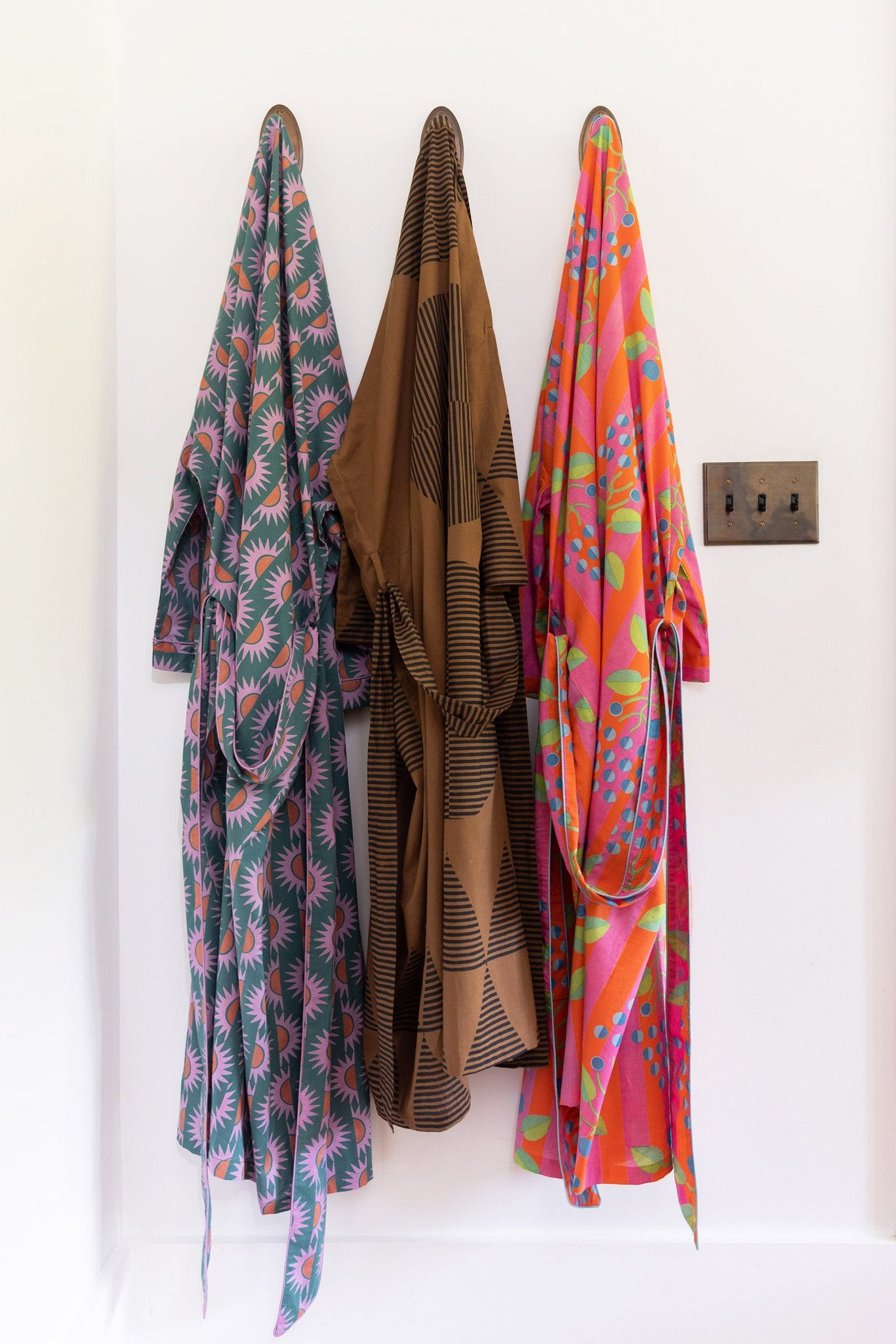 A statement robe for our neutrals people. Our temple print is a riff on the wall drawings of Sol LeWitt in a rich, walnut brown with soft black printing. A refined palette / pattern combo that will take you straight to relaxation station.