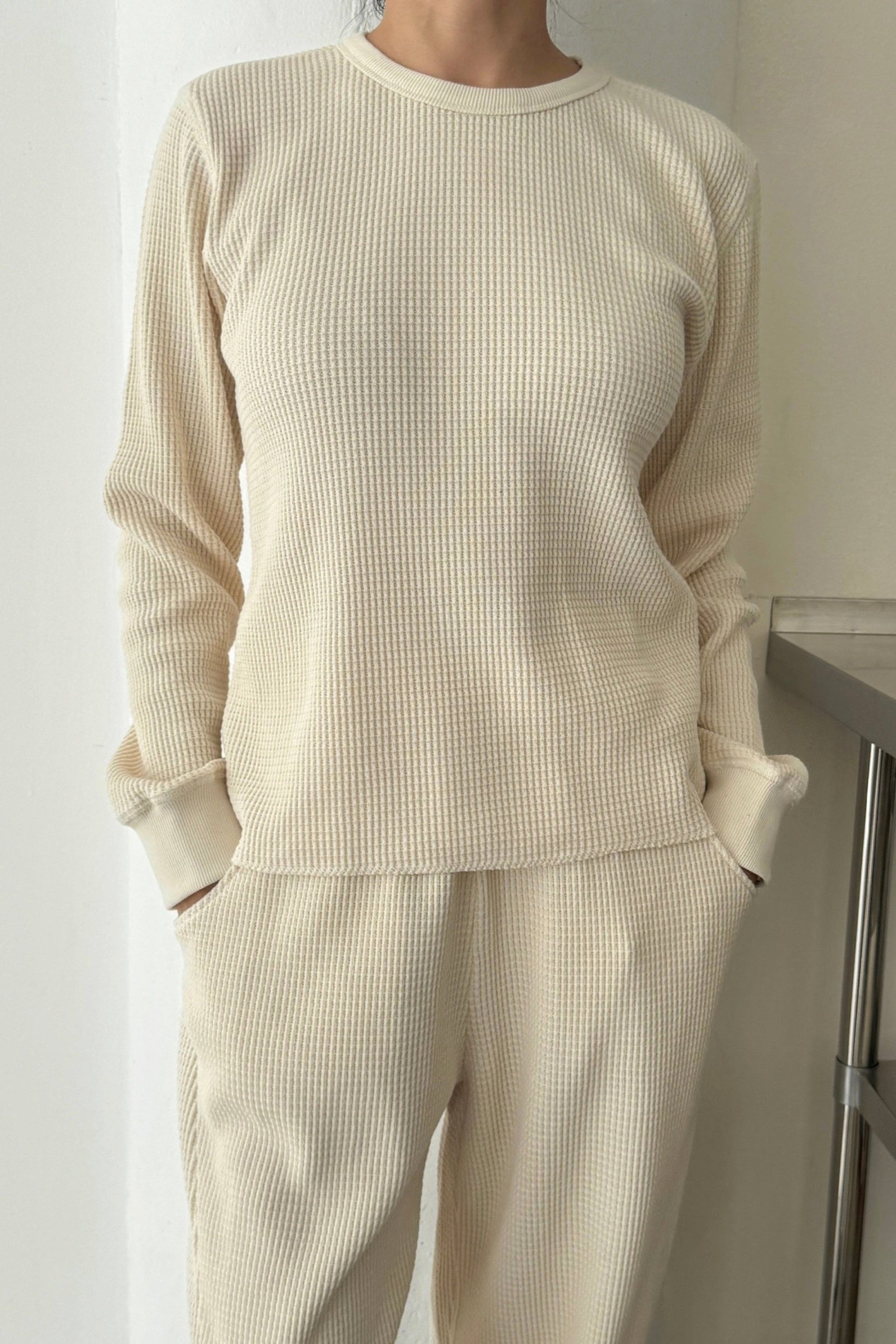 The Waffle Fundamental Tee is crafted from a new heavyweight waffle cotton blend with beautiful structure and softness. A classic long-sleeve crew with baby ribbed cuffs and a close, easy fit designed for layering, lounging, and living in.