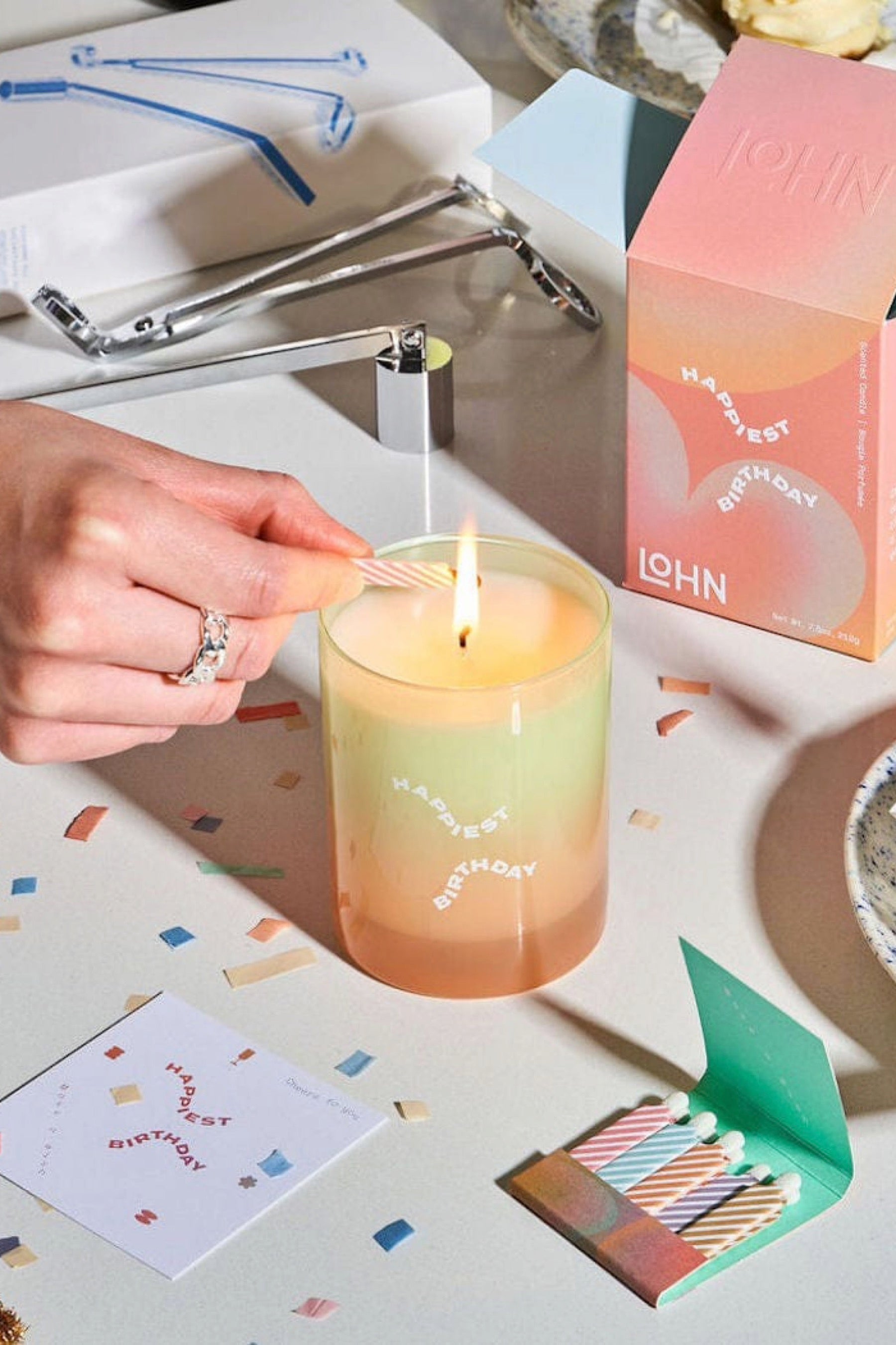Inside you'll find confetti, a birthday card and a matchbook filled with birthday candle matchsticks.