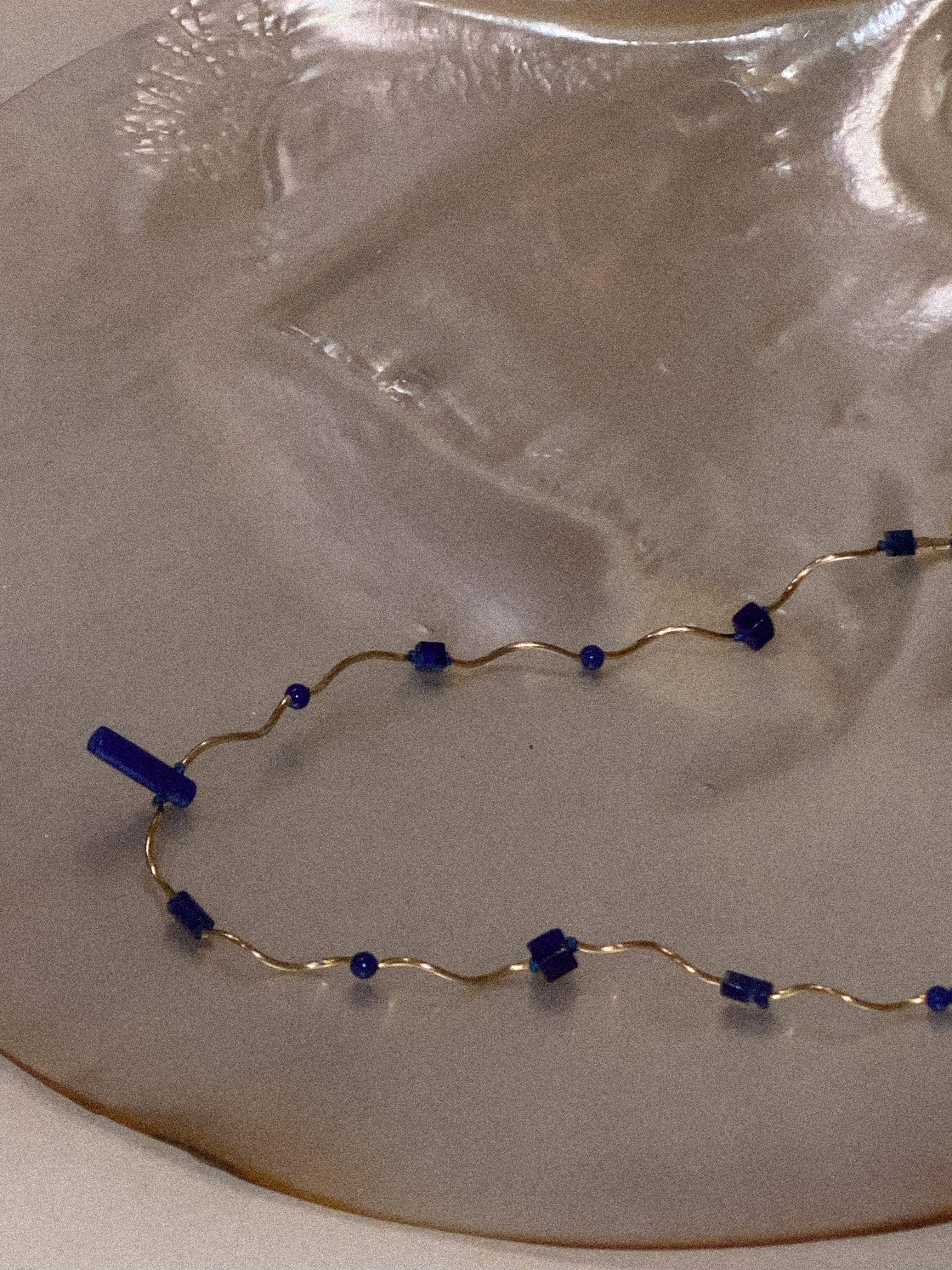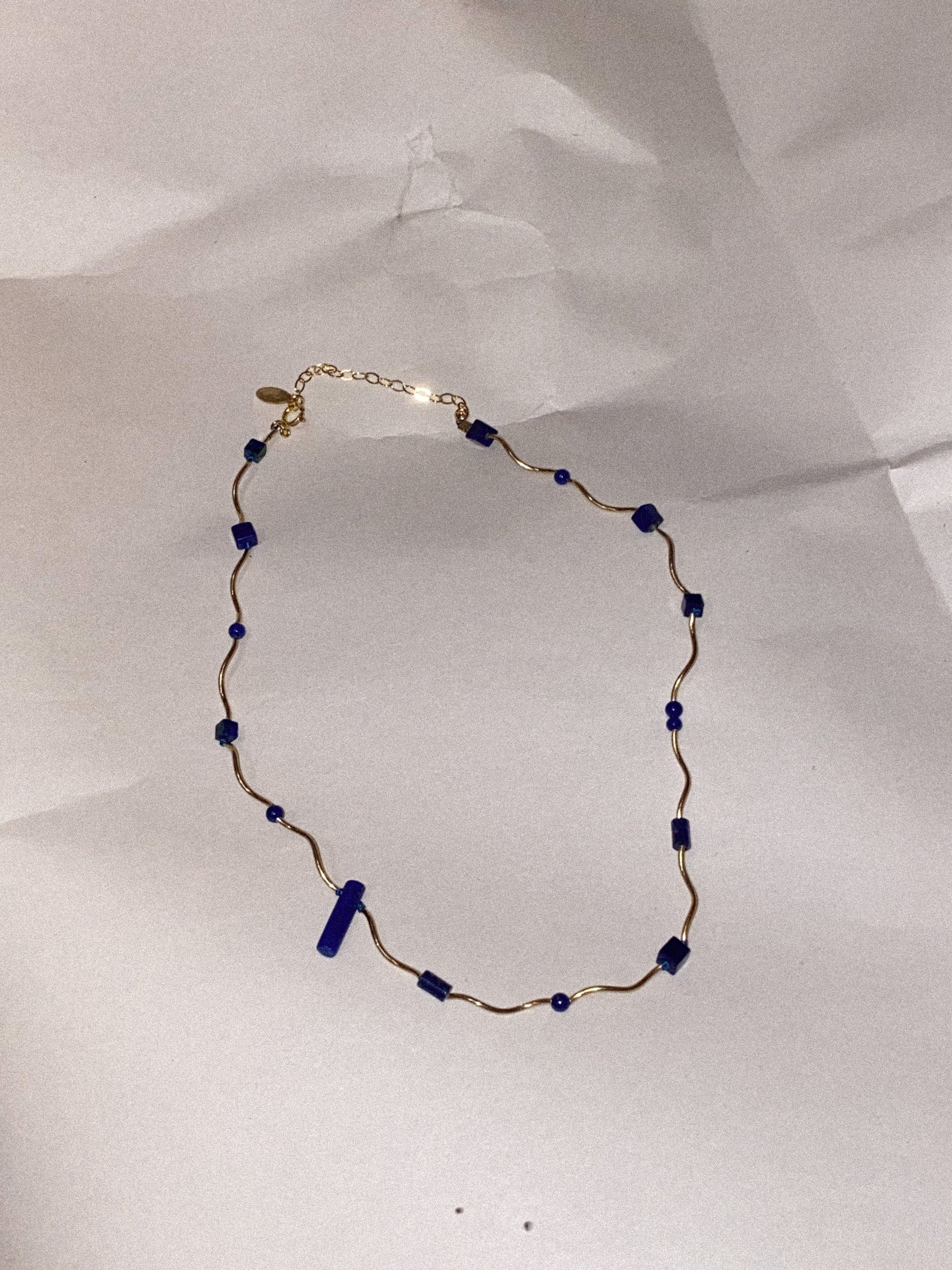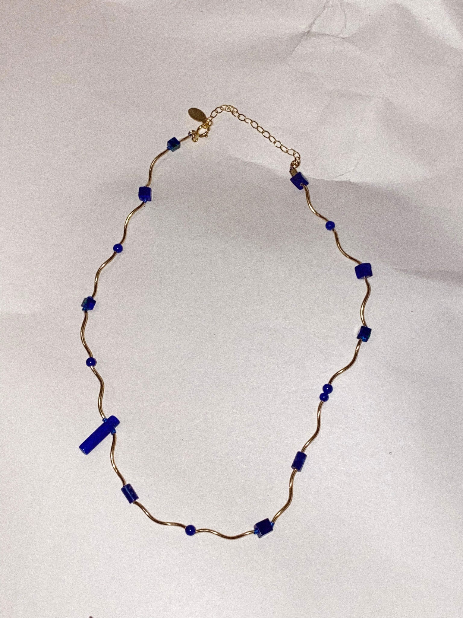 This necklace features a mix of Lapis Lazuli, Azurite, and Sodalite. We love how fun and delicate this style is. The monochrome blue is eye catching and it’s a subtle play on shapes and line.