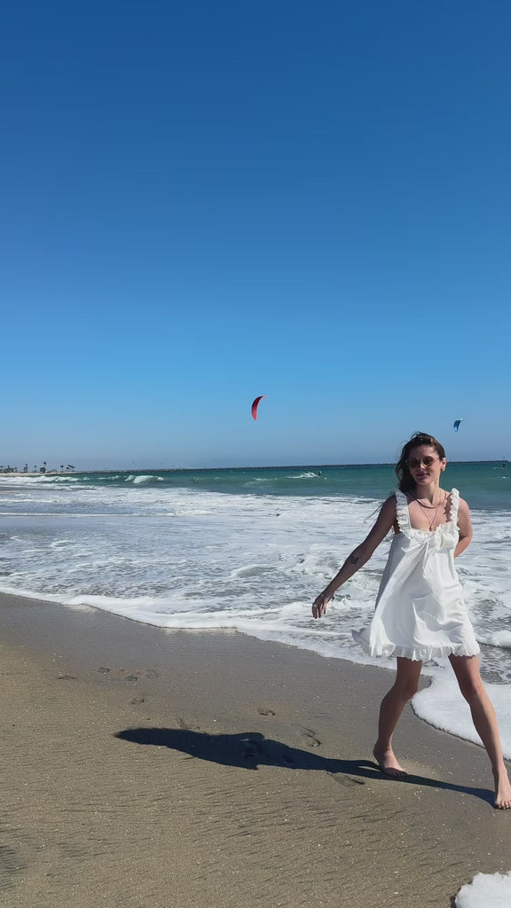 Cotton mini dress with ruffle hem and collar detail, adjustable straps, fully lined.