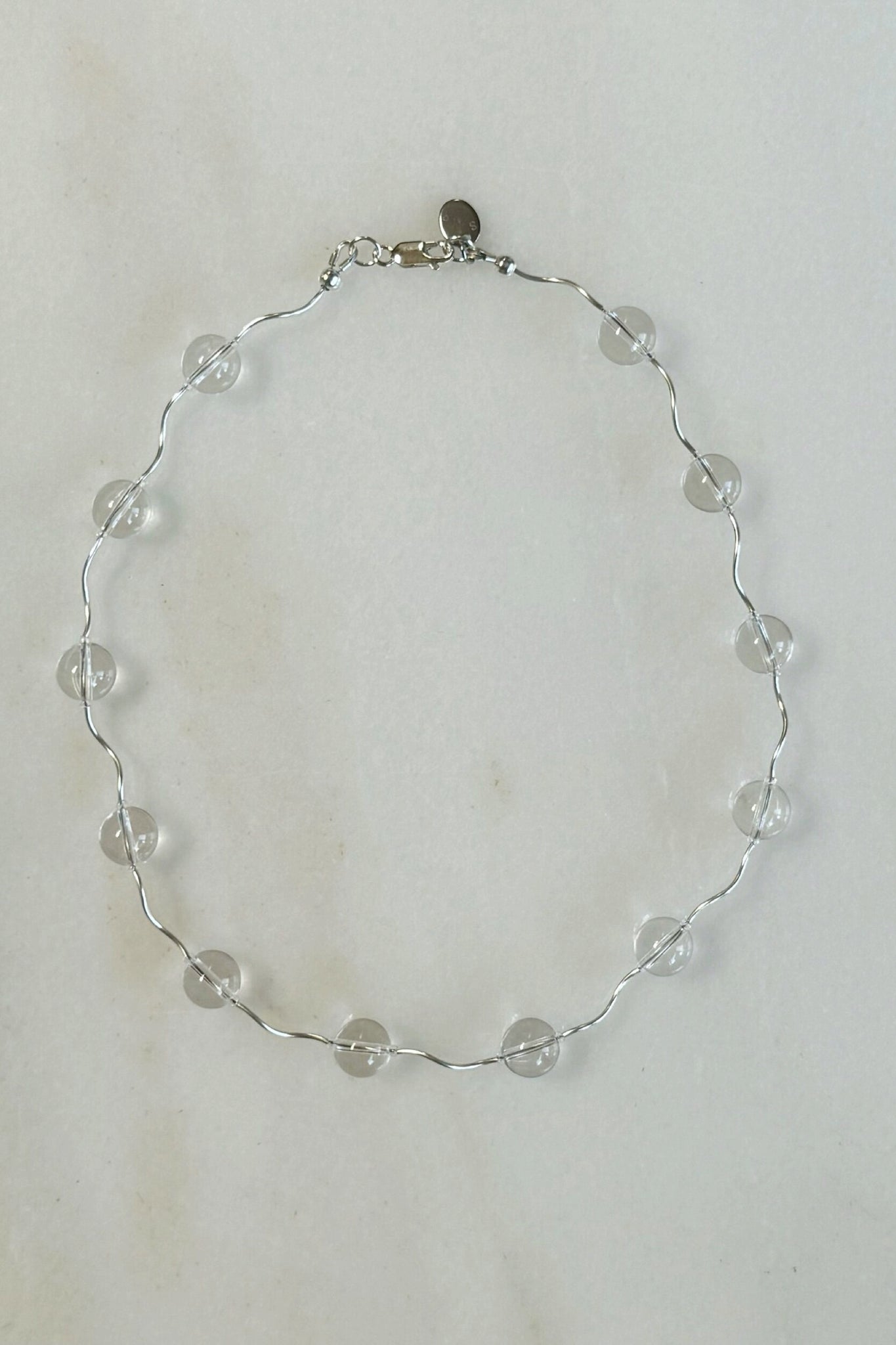 Beaded necklace featuring clear quartz and sterling silver tube beads with a sterling silver clasp. Each necklace is one of a kind and will vary slightly from the photo.