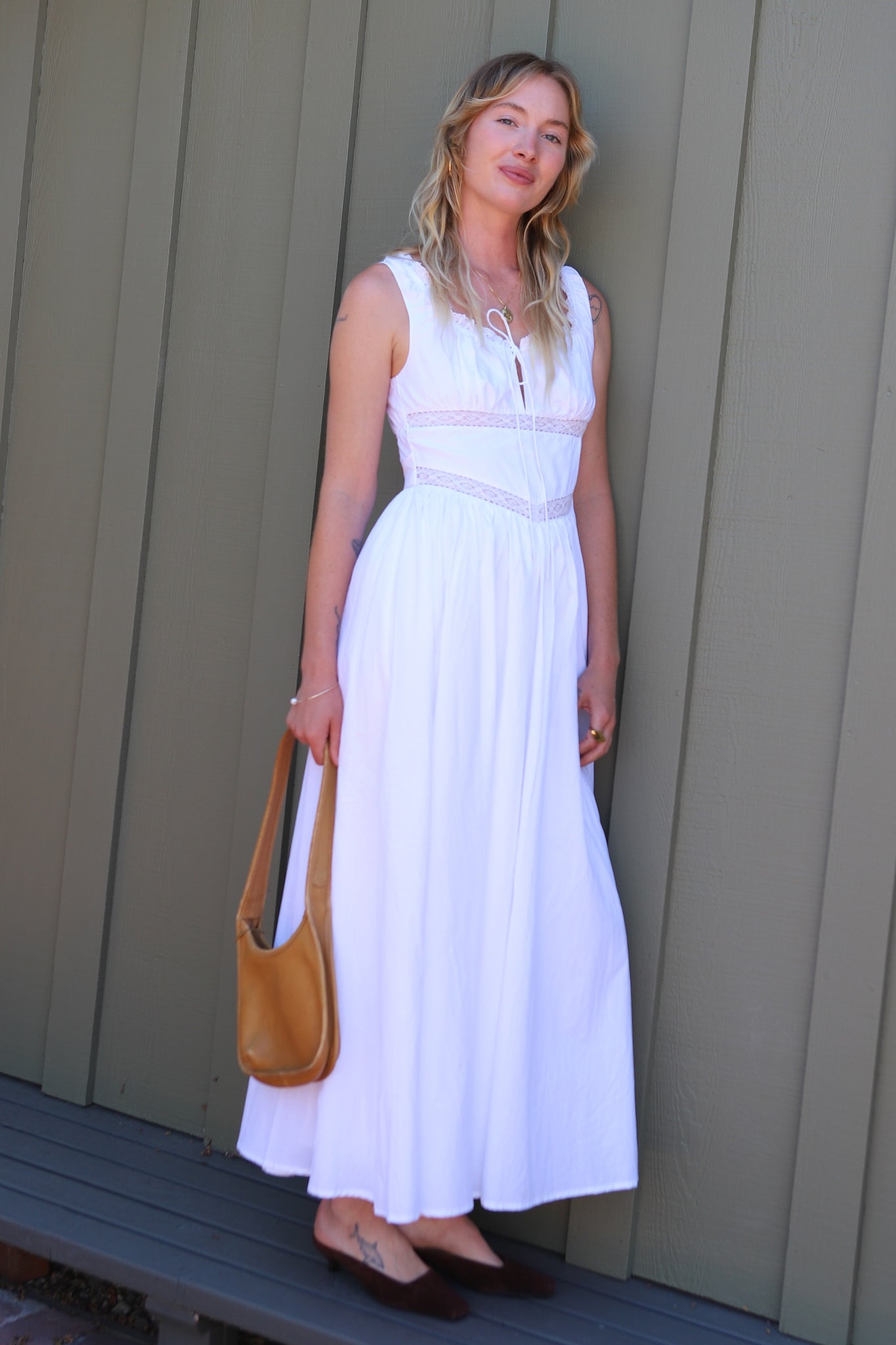 Corset detail maxi dress with cinch tie back and cotton liner throughout.