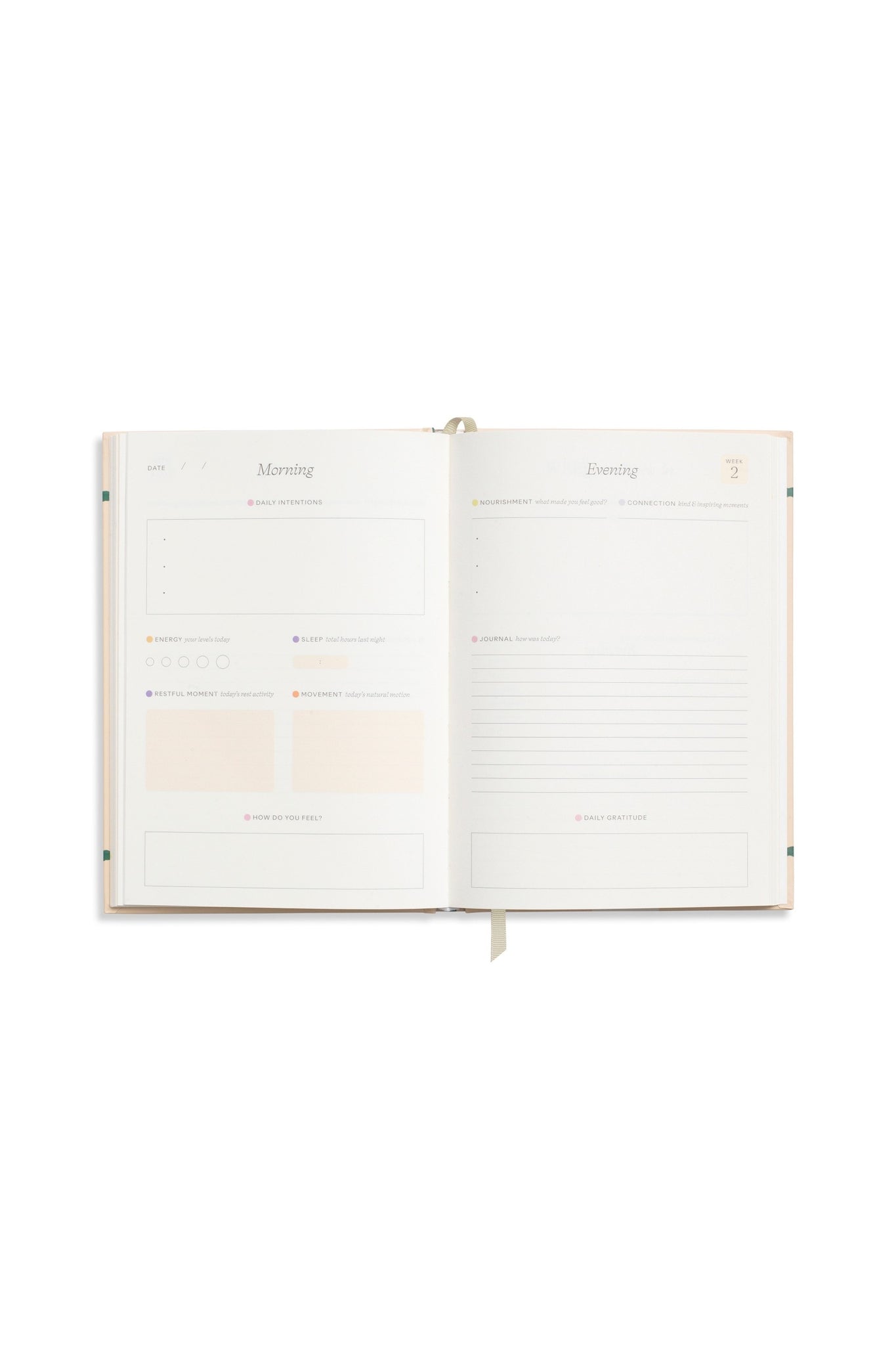• 12 weeks worth of daily overview pages (two-page spread for each day), with space for logging intentions, sleep and energy levels in the morning and evening