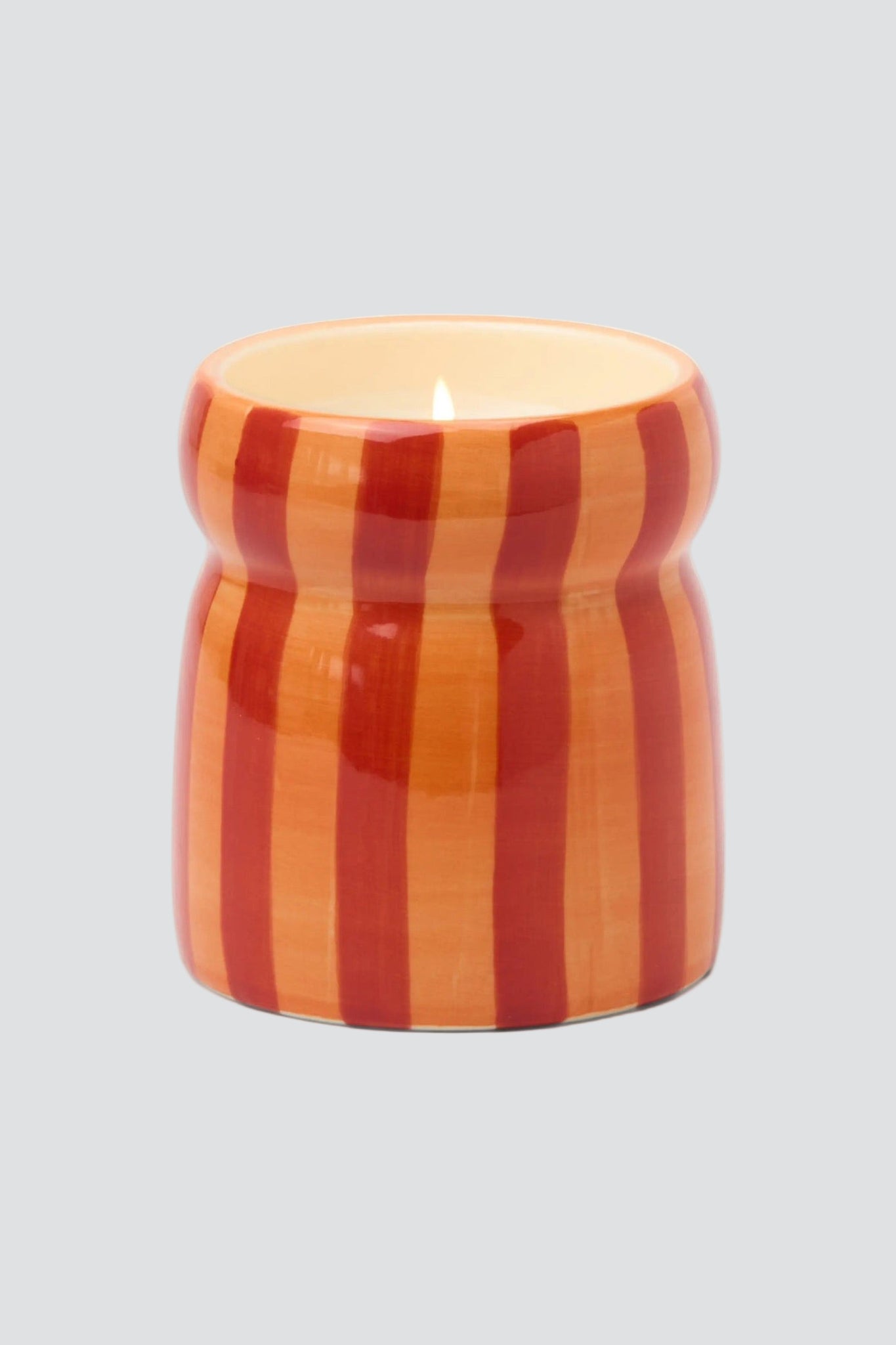 Bring home the holiday season with the Spiced Apple cabana ceramic candle. Housed in a hand-painted orange and red vessel with a matching lid, this festive candle blends crisp apple with warm spices for a cozy, nostalgic scent. Once the candle has finished, the lidded ceramic jar can be reused as a decorative container or storage piece.