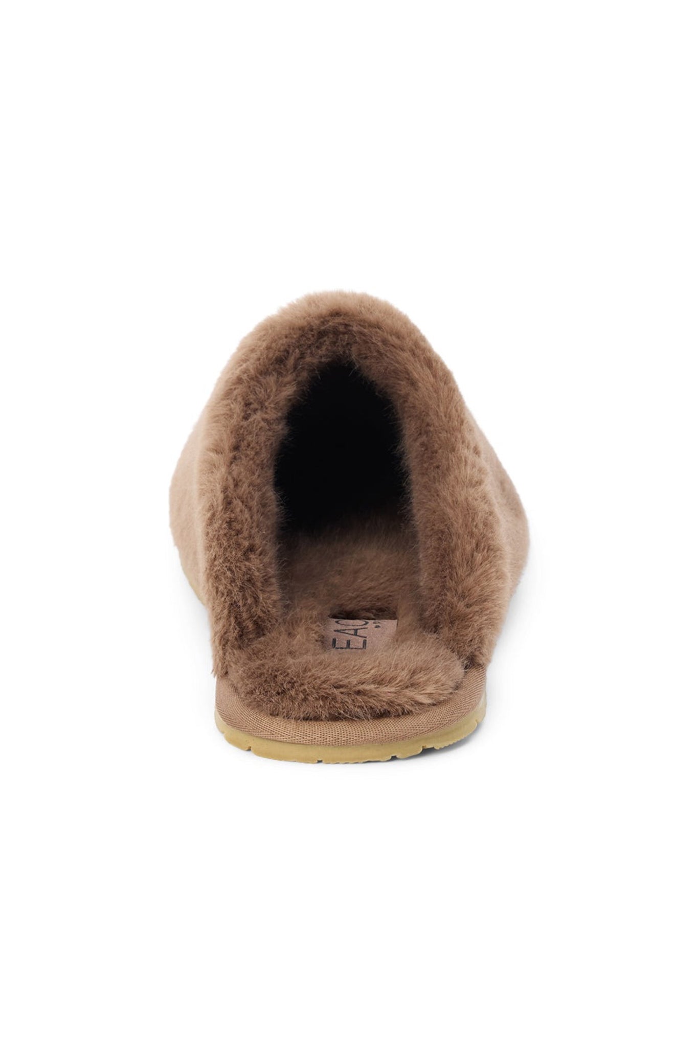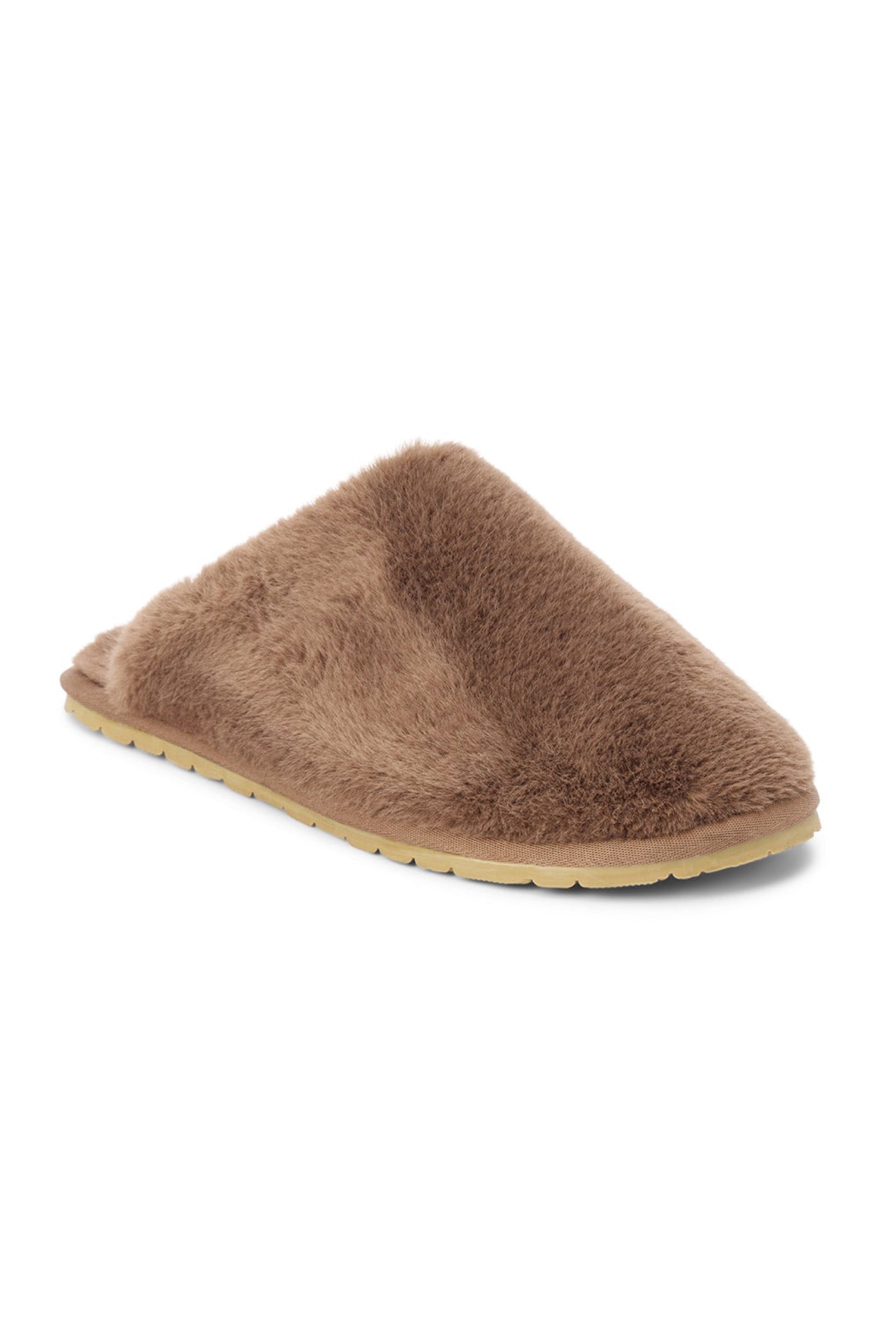 Faux fur slip-on style slipper with a rubber sole that can be worn both in and out of the house.