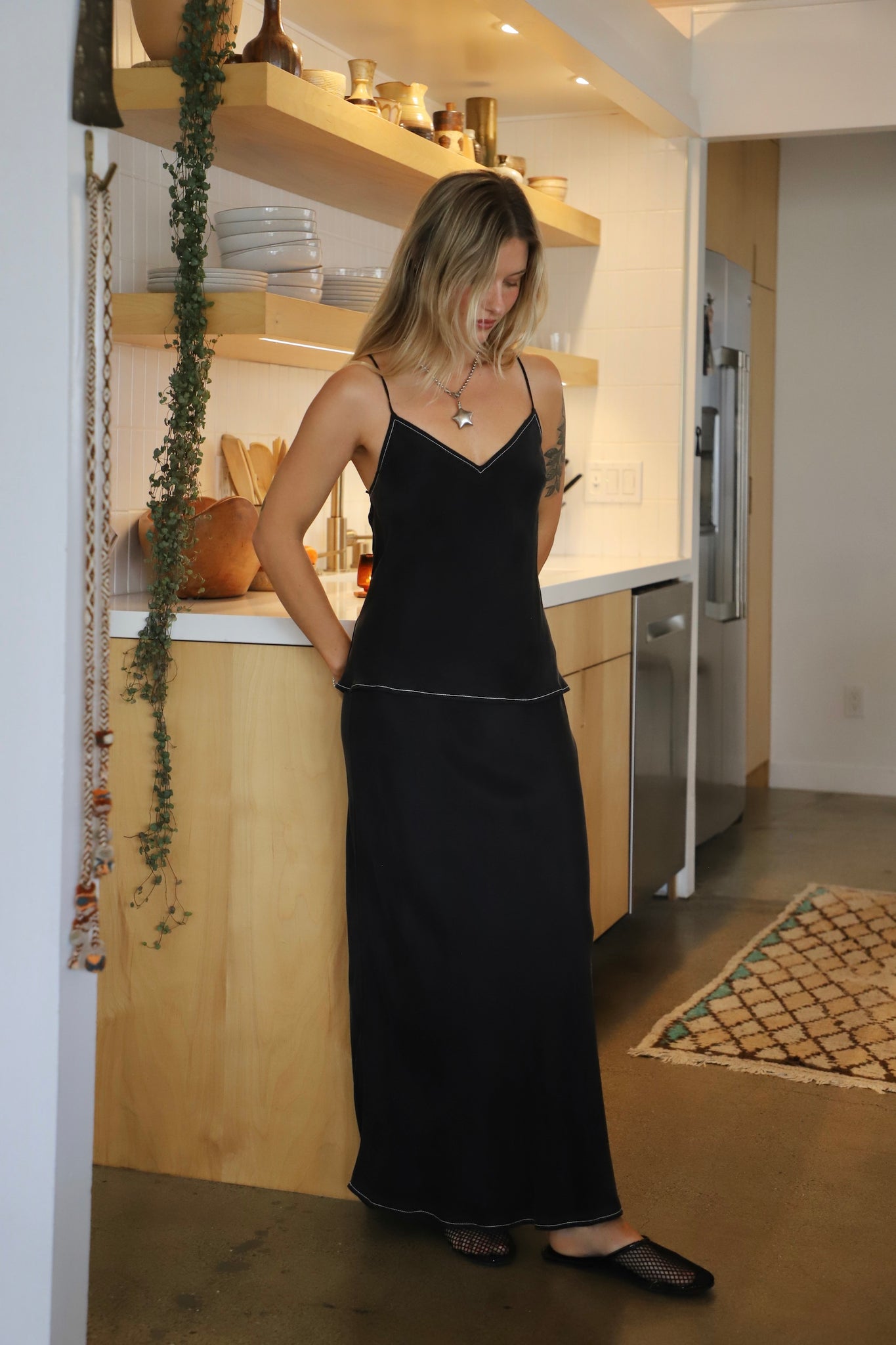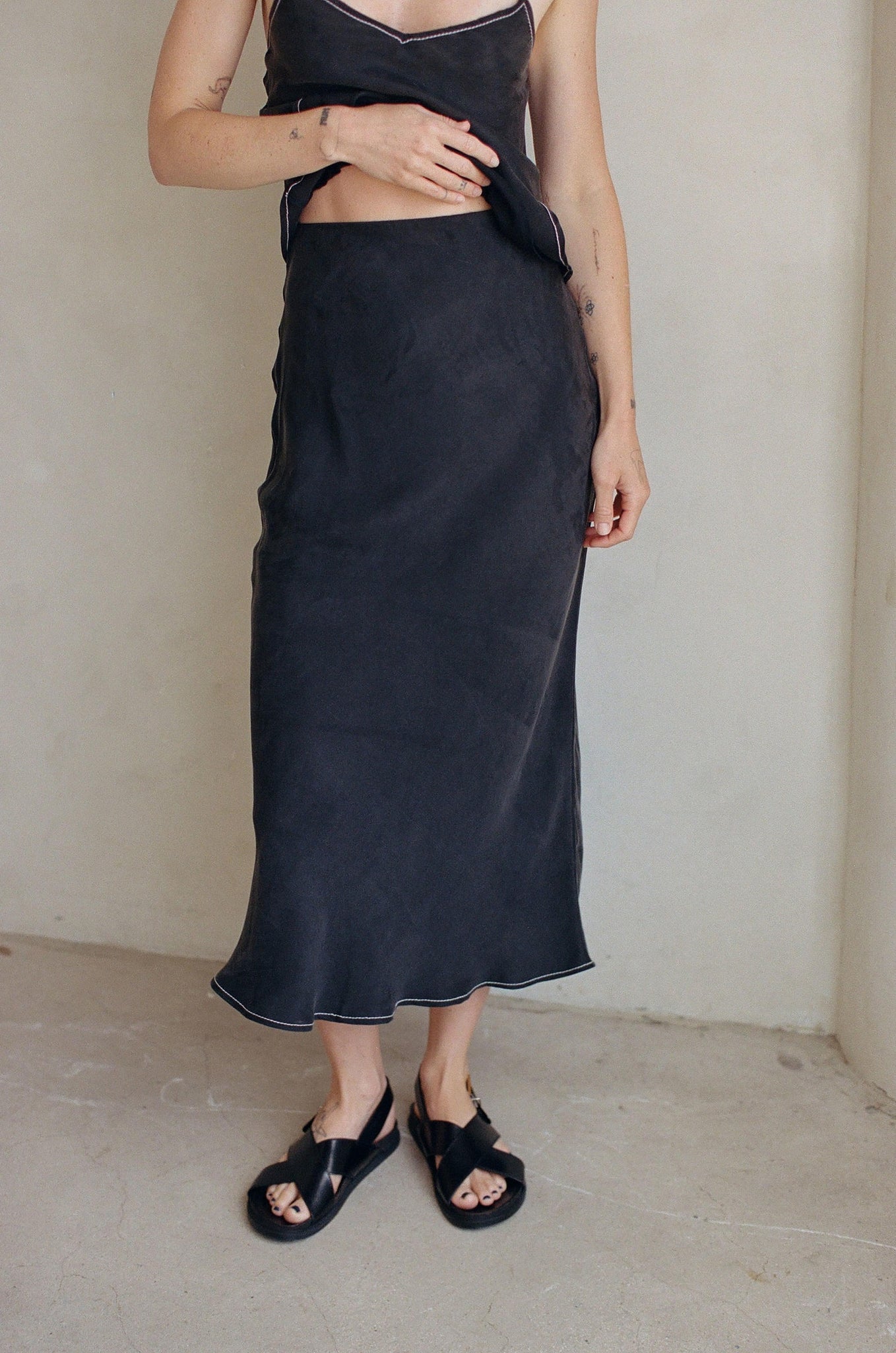 This midi style features a chic bias cut and contrast stitch details with an elastic waist.