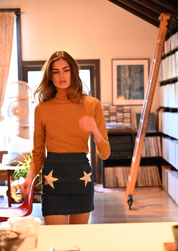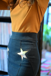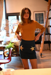 We've got your back, babe. Super flattering mini with zipper in back. Just add a pair of vintage cowboy boots for an oh so dreamy denim moment. Crafted from the finest recycled salvage Italian & Japanese denim so it’ll only get better with time. Contrast paneling with french seams & gold vegan leather shines from within each star. Made in Los Angeles, California.
