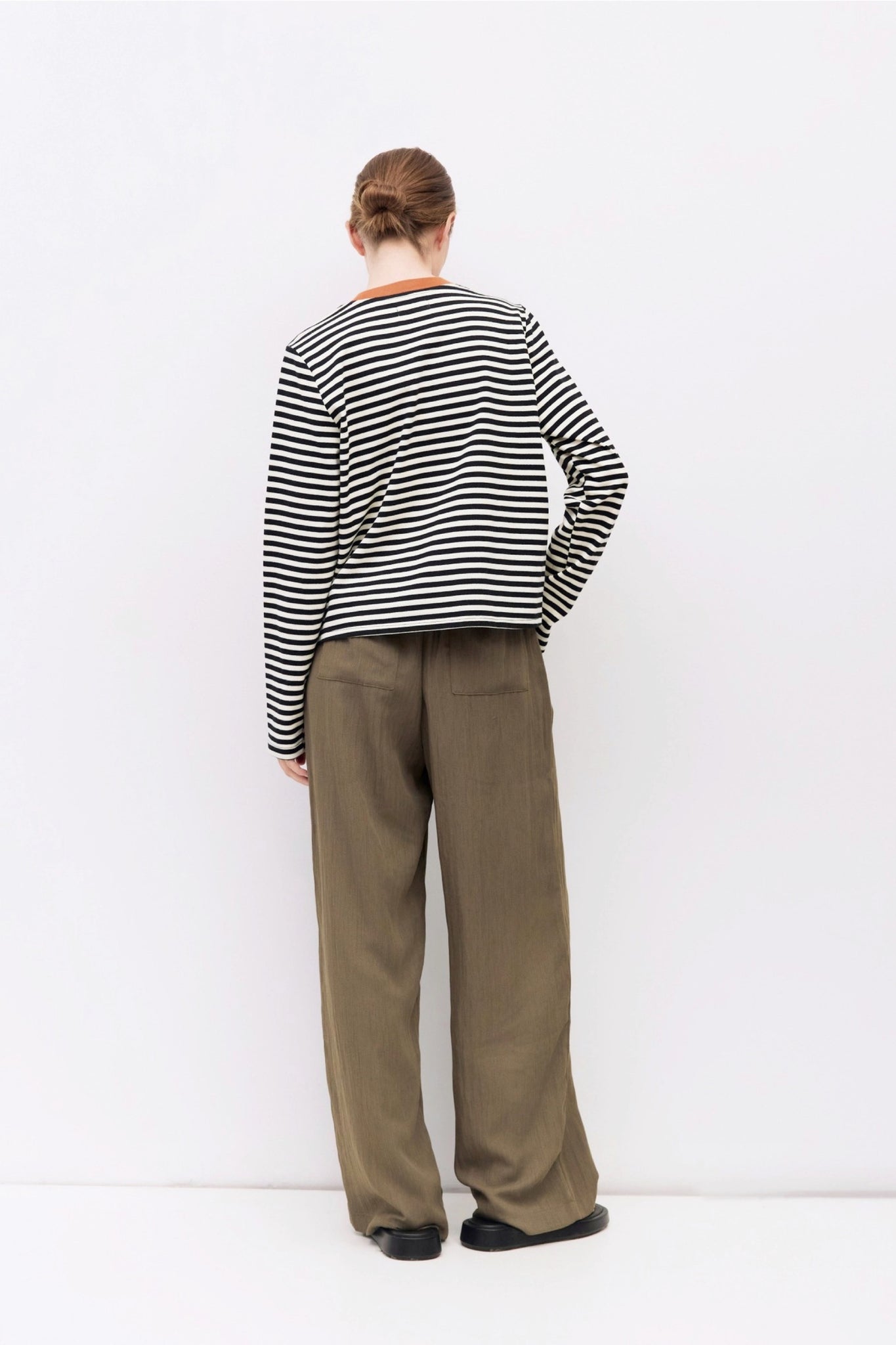 The Kathleen Top is a relaxed-fit long-sleeve shirt made from midweight striped fabric. It features a contrast color crewneck and long sleeves for a classic, casual look. Perfect for everyday wear with effortless style.