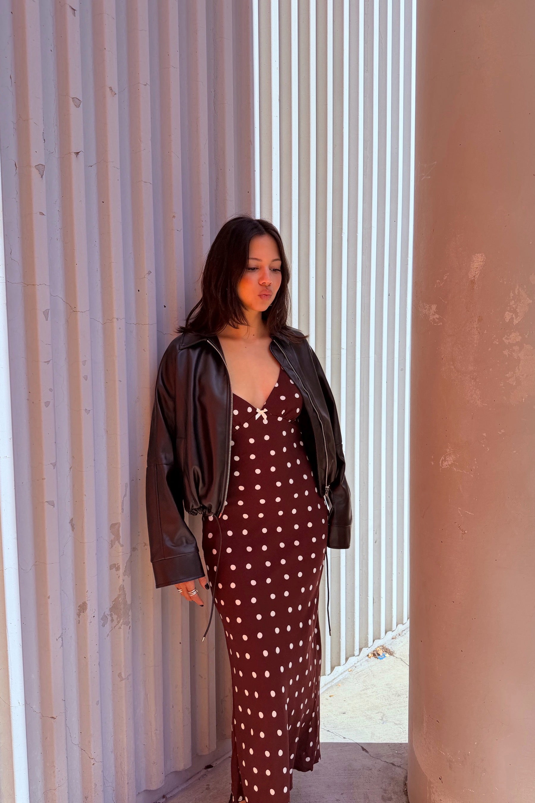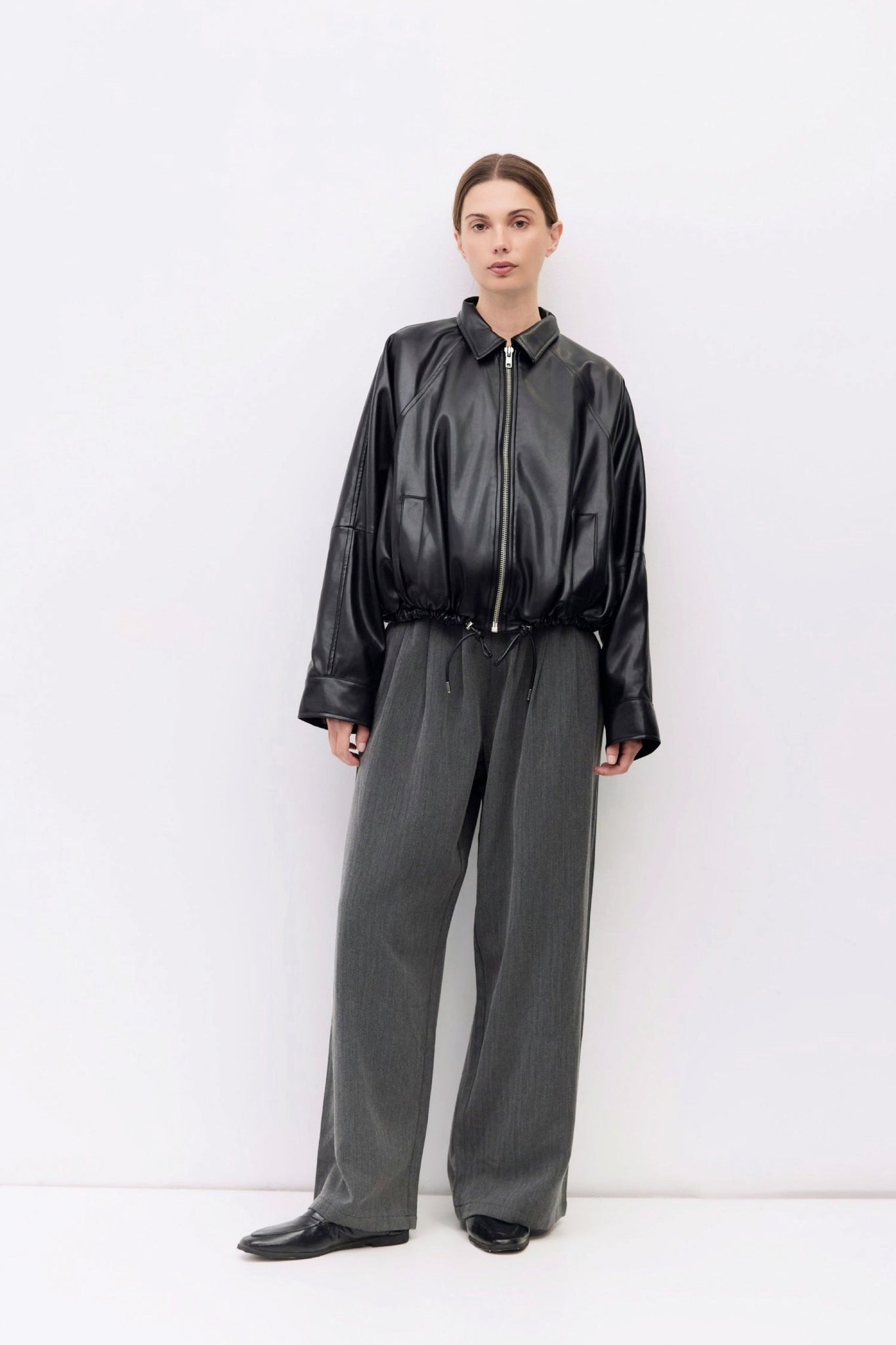 The Lizette Jacket is a semi-cropped bomber crafted from soft pleather with a structured drape. Designed with a collared neckline, front zip closure, and a drawstring hem to adjust the shape.
