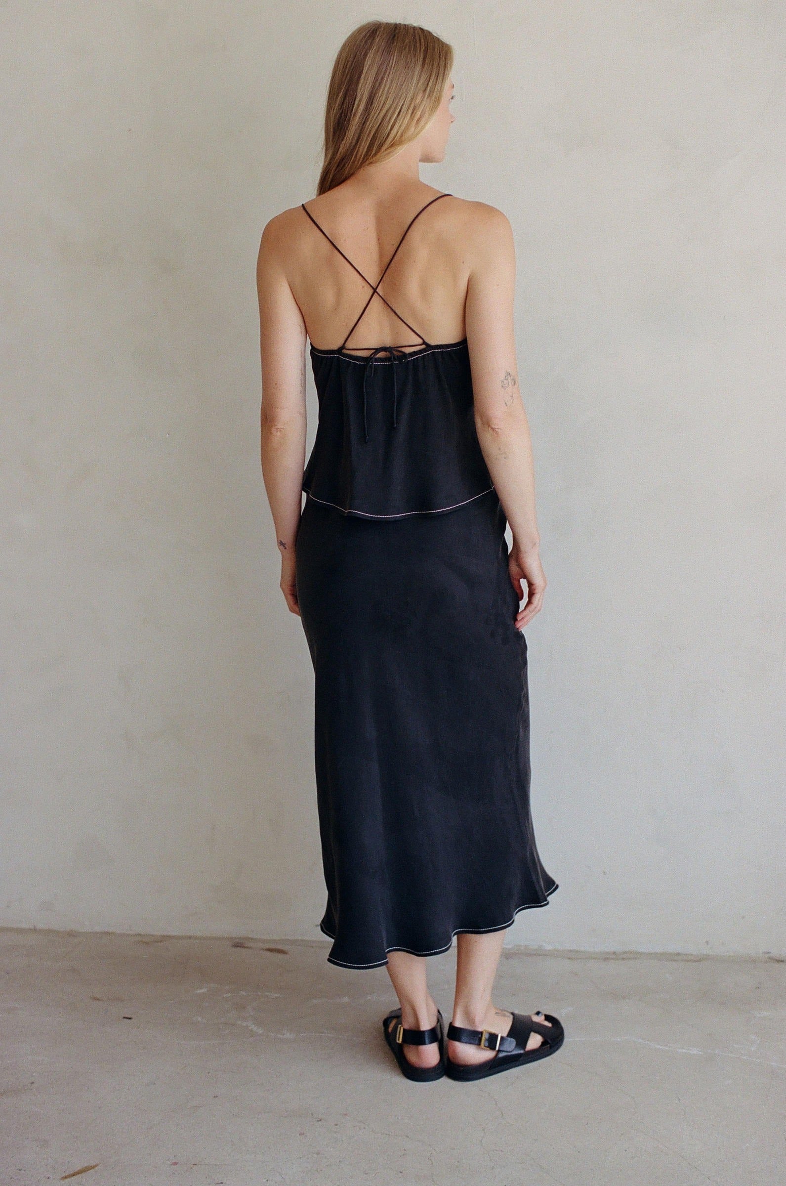 Featuring skinny straps and an adjustable tie, this v-neck tank is perfect for any occasion. The contrast stitching adds a unique touch to an already chic design.