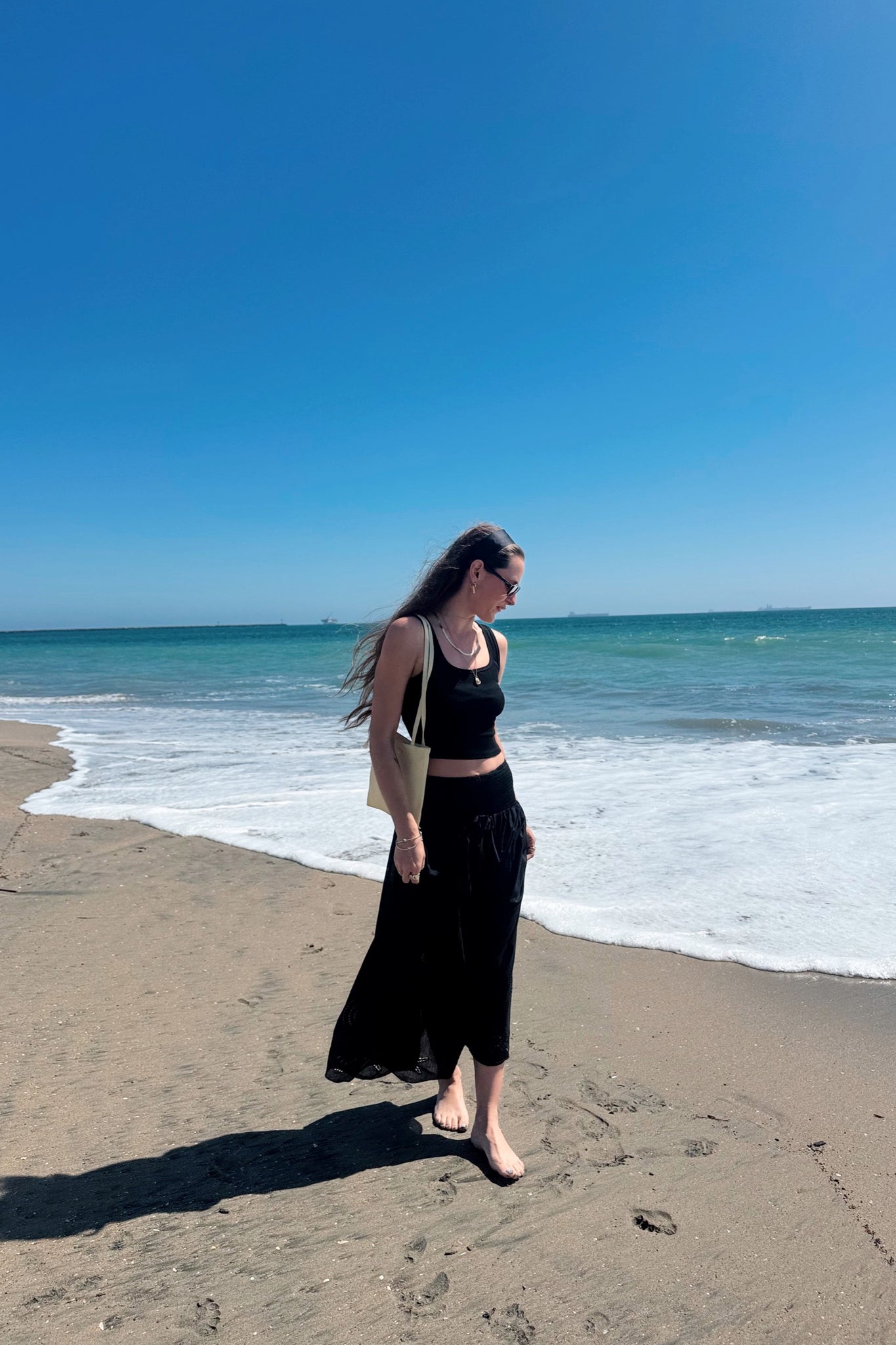 This tank features a square neckline and cropped length in a ribbed knit construction. The style works well for layering or as a standalone piece, making it a practical addition to a curated wardrobe.