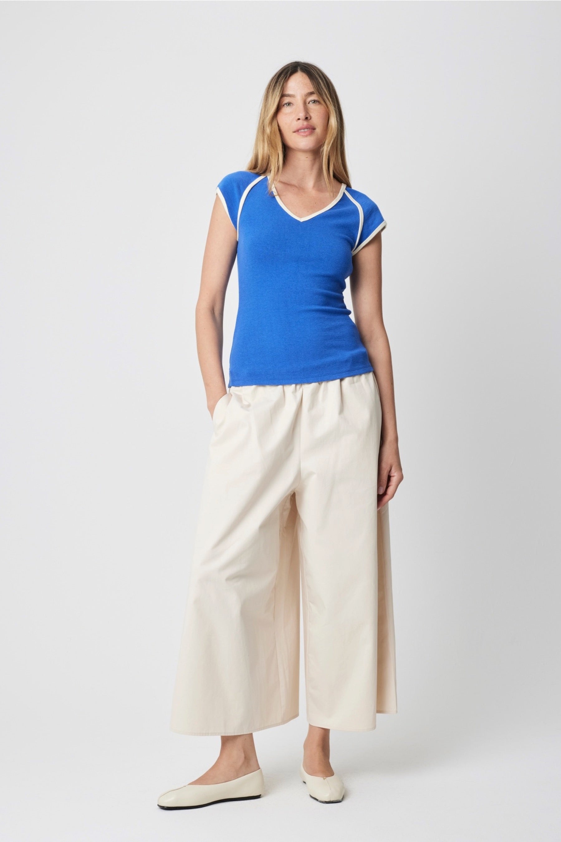 The Patricia Top is crafted from a midweight cotton-blend knit with a form-fitting silhouette. Its V-neckline and raglan cap sleeves are accented with contrast stripes at the neckline, cuffs, and armhole seams for a retro-inspired look.