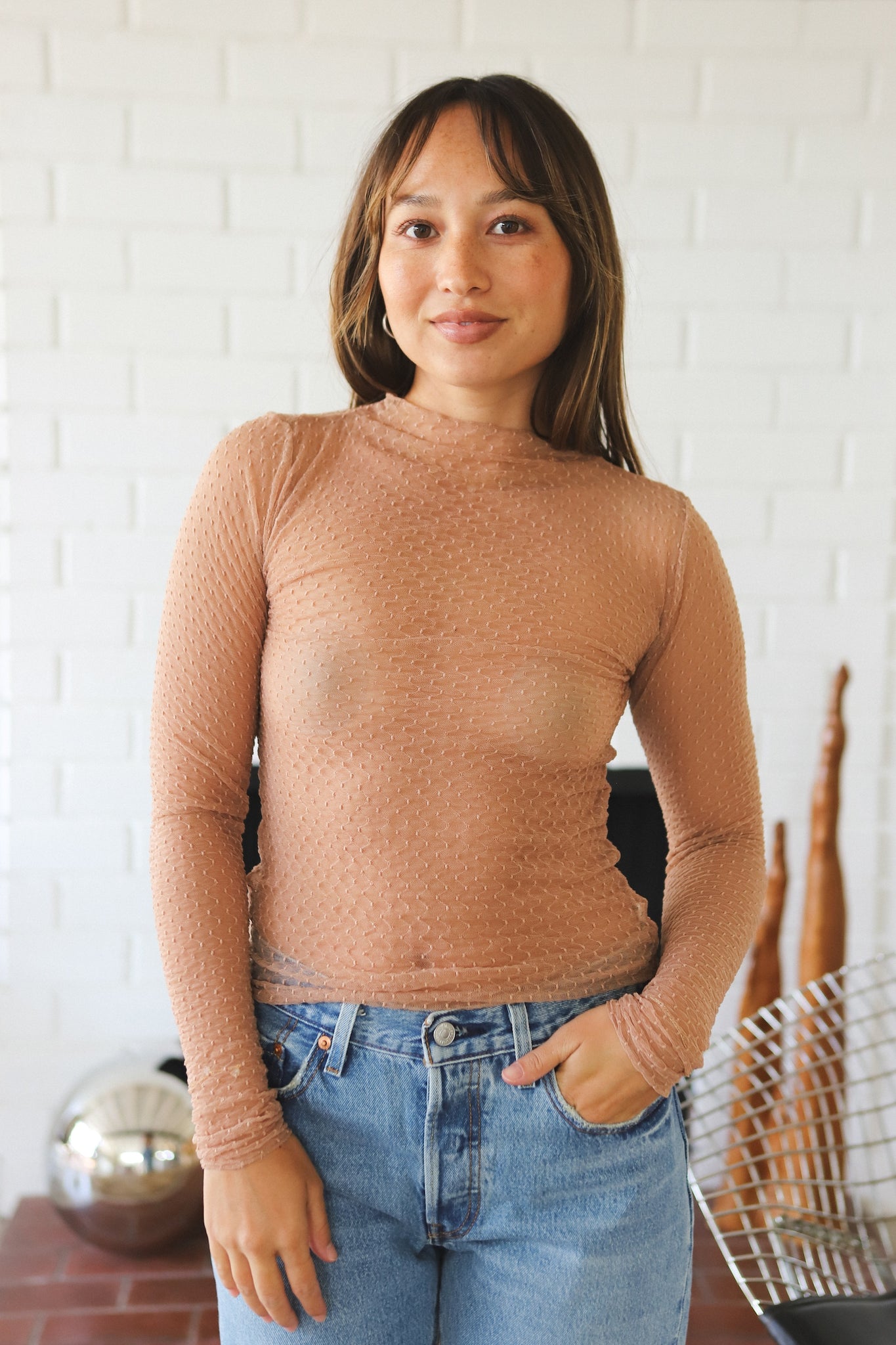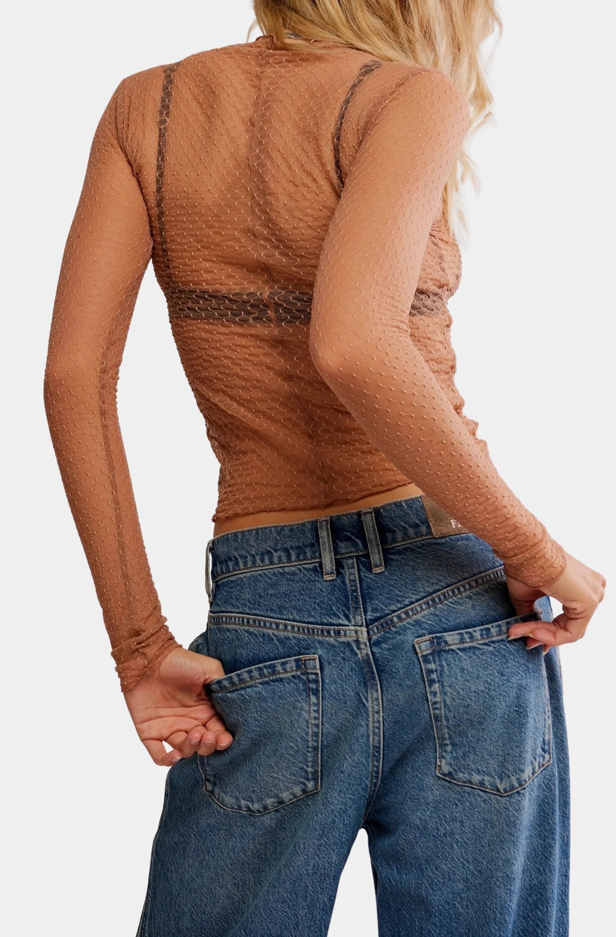 Add the perfect layer to every look with this effortless long-sleeved top featured in a sheer, textured fabrication, ideal to style over anything from a tank to a barely-there bralette.