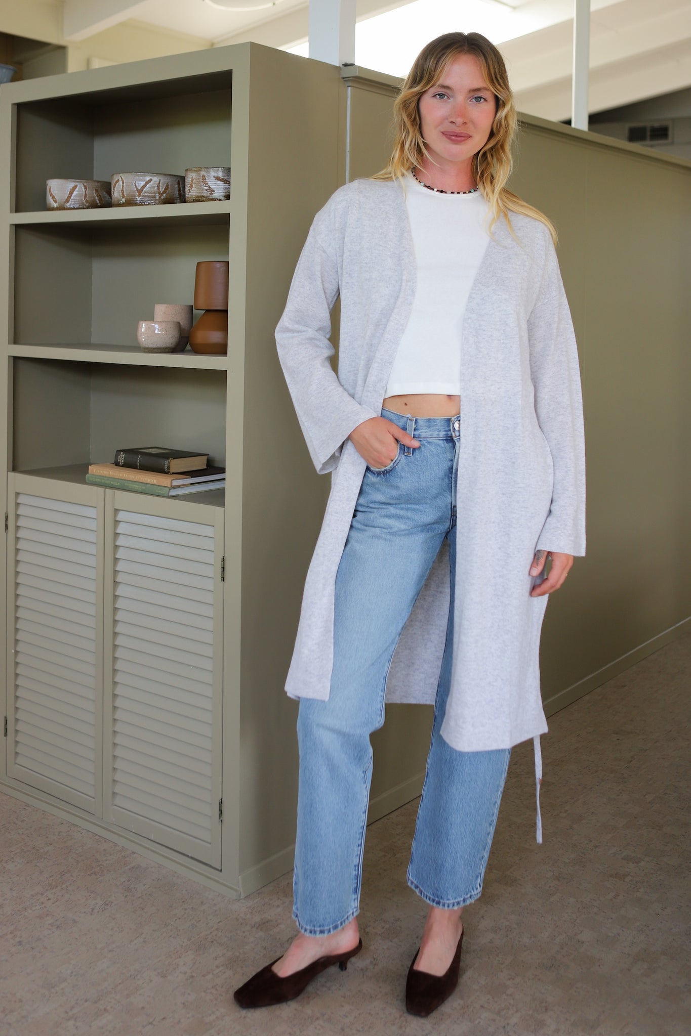 Wrap yourself in cozy elegance with this grey long cashmere cardigan. Featuring a playful tie detail around the waist, it adds a flattering touch while keeping you snug and stylish. Perfect for layering on chilly days, this soft cardigan effortlessly blends comfort with chic charm.