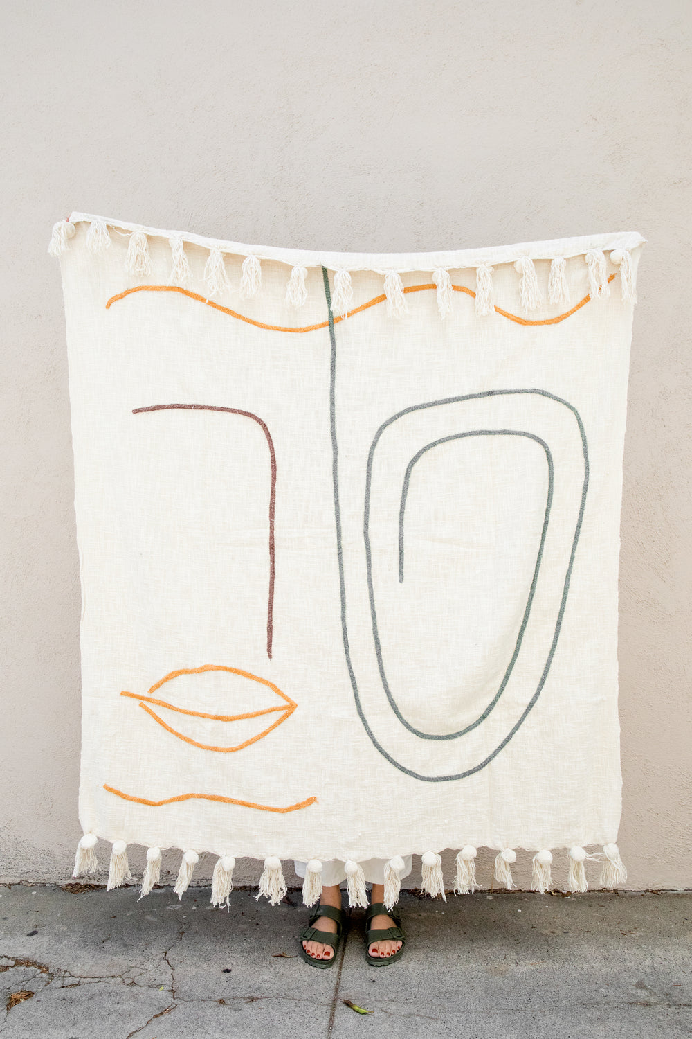 This cozy blanket with abstract embroidered stripes is perfect for a summer night on the beach or at the end of your bed!