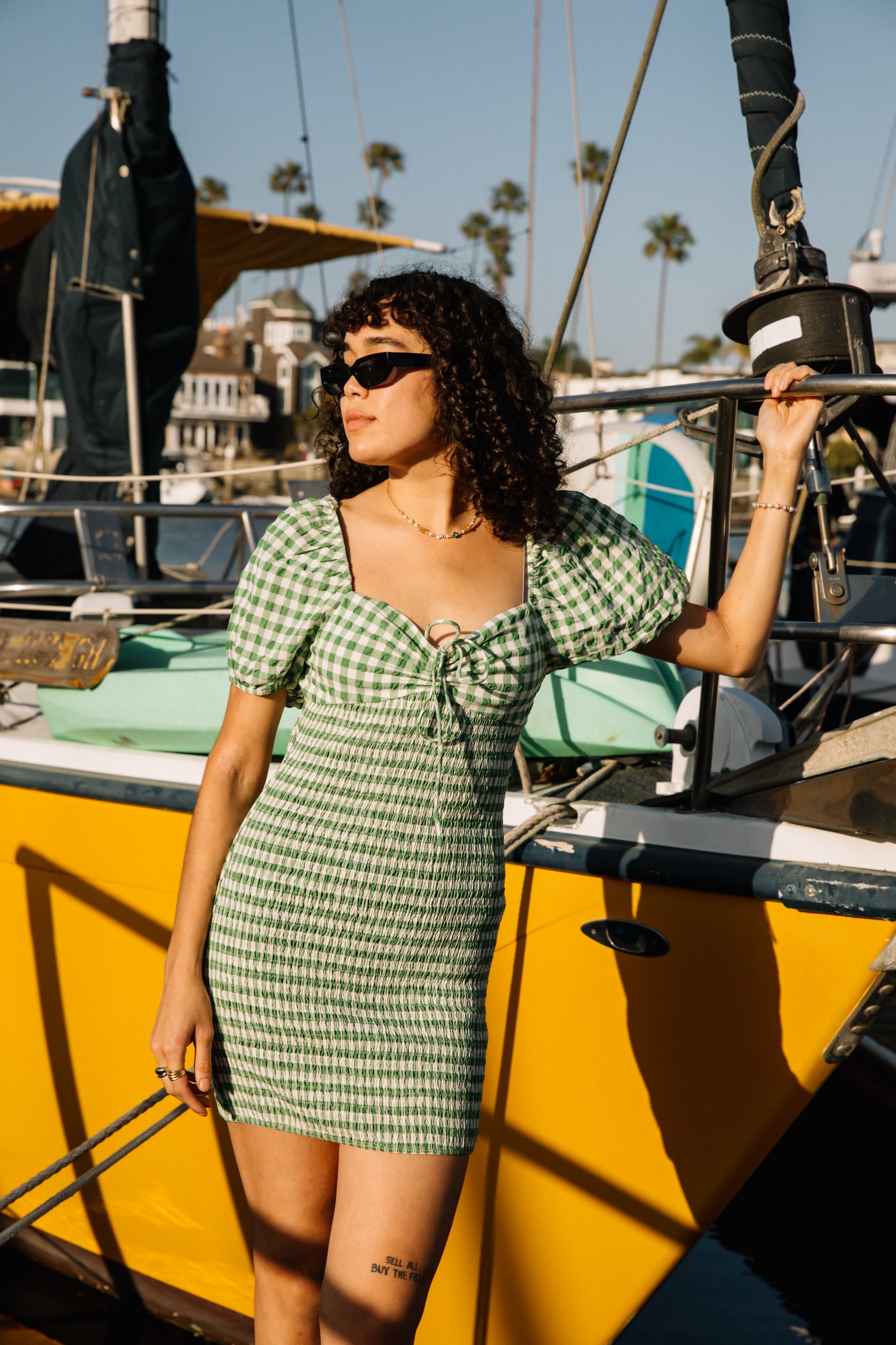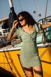 This dress will be your lucky charm! Cute little green gingham mini dress features puff sleeves and shirred body.