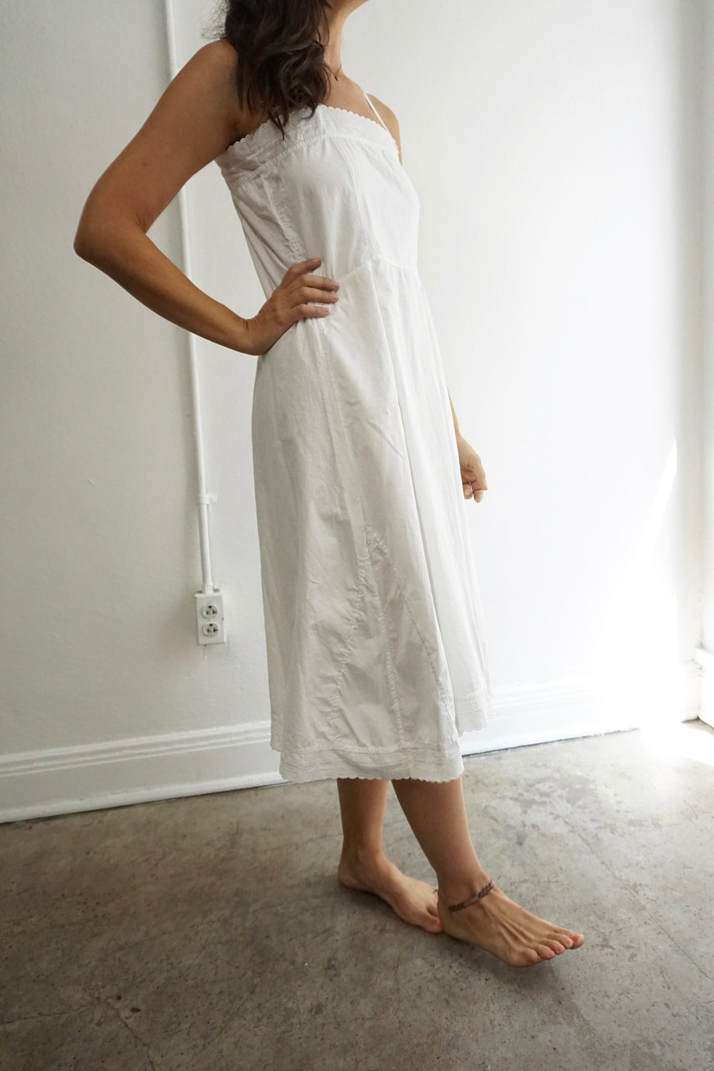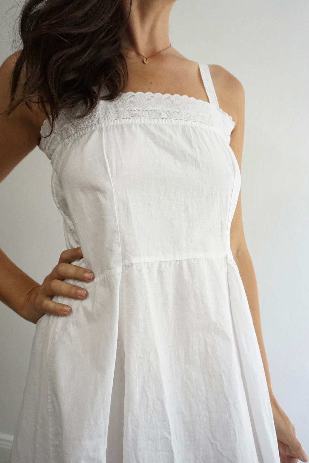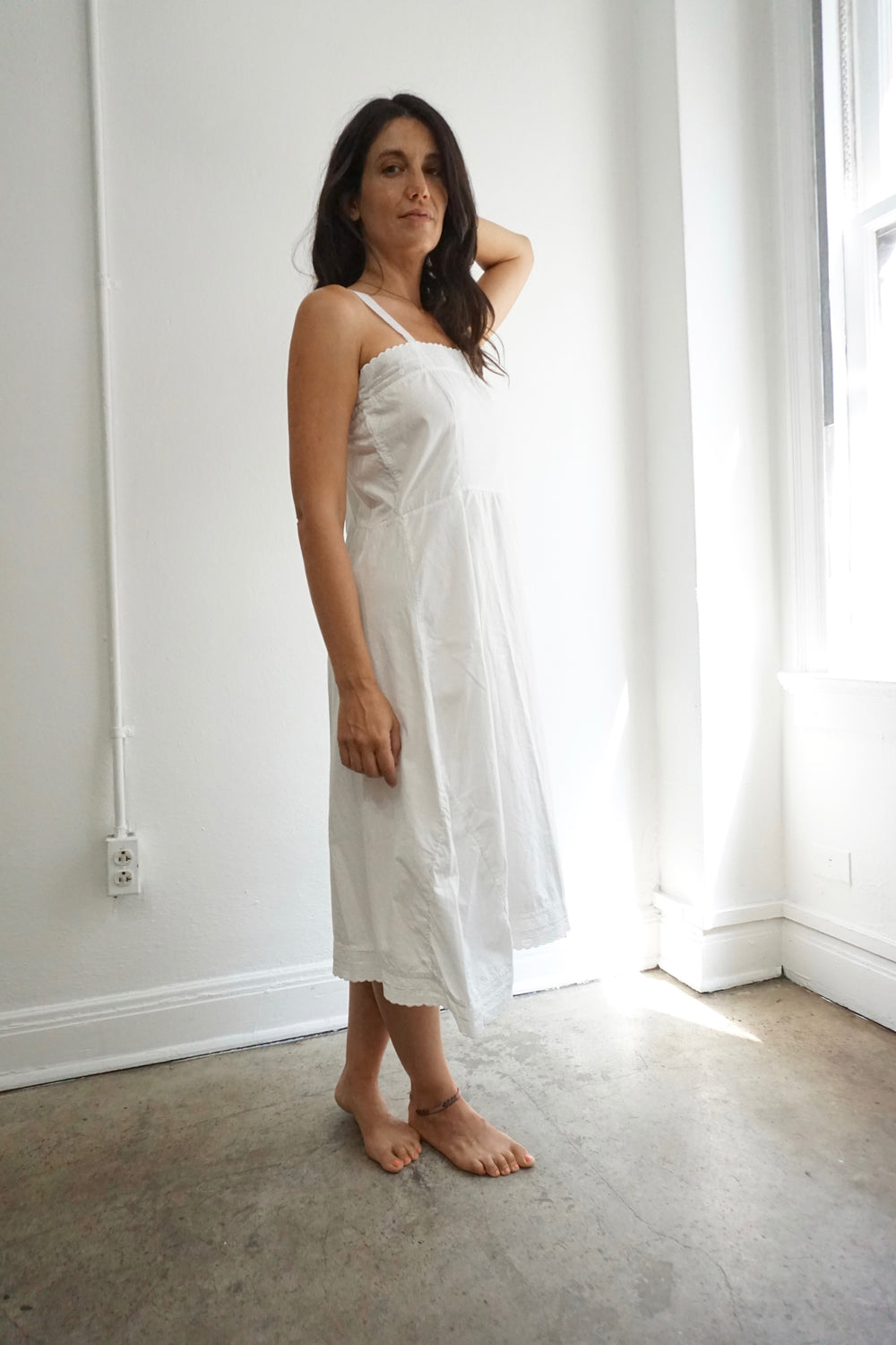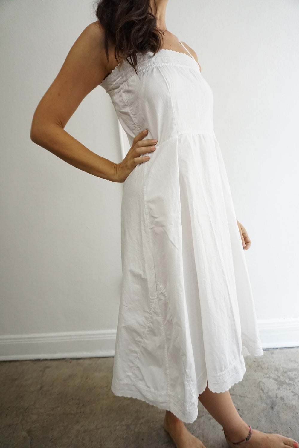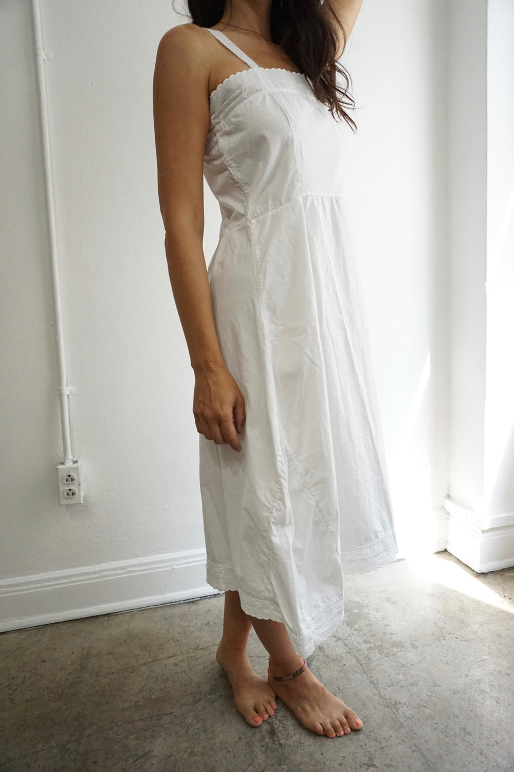 1930s white cotton slip dress. Scalloped trim along neckline & hem. Fitted waist. Bust darts.