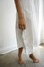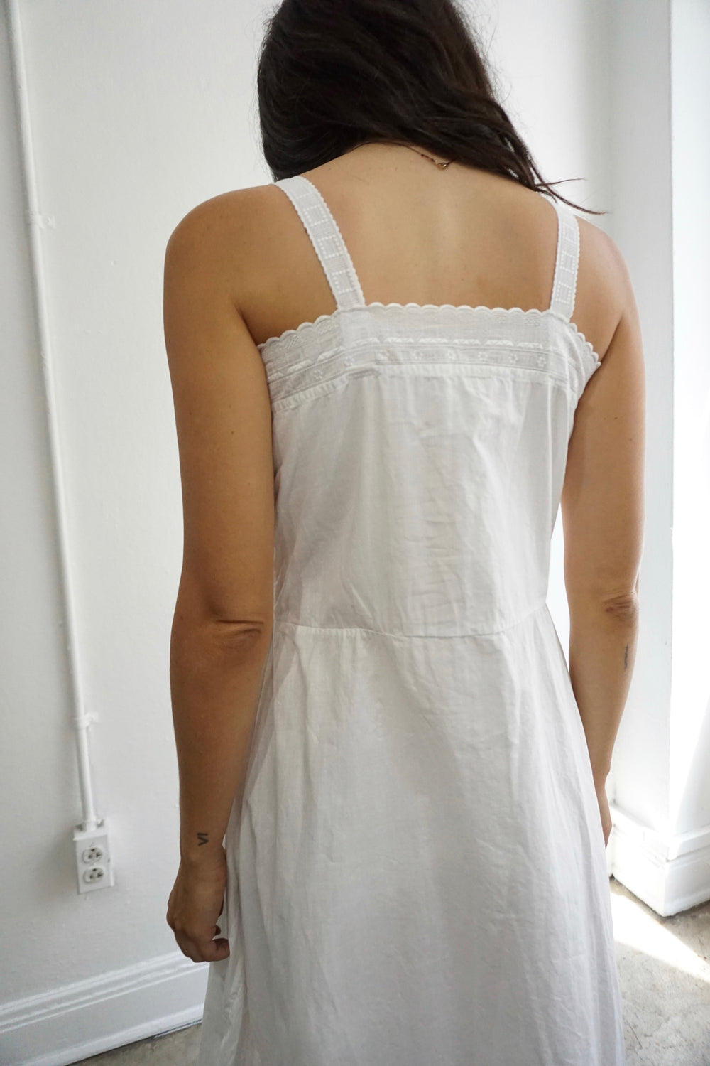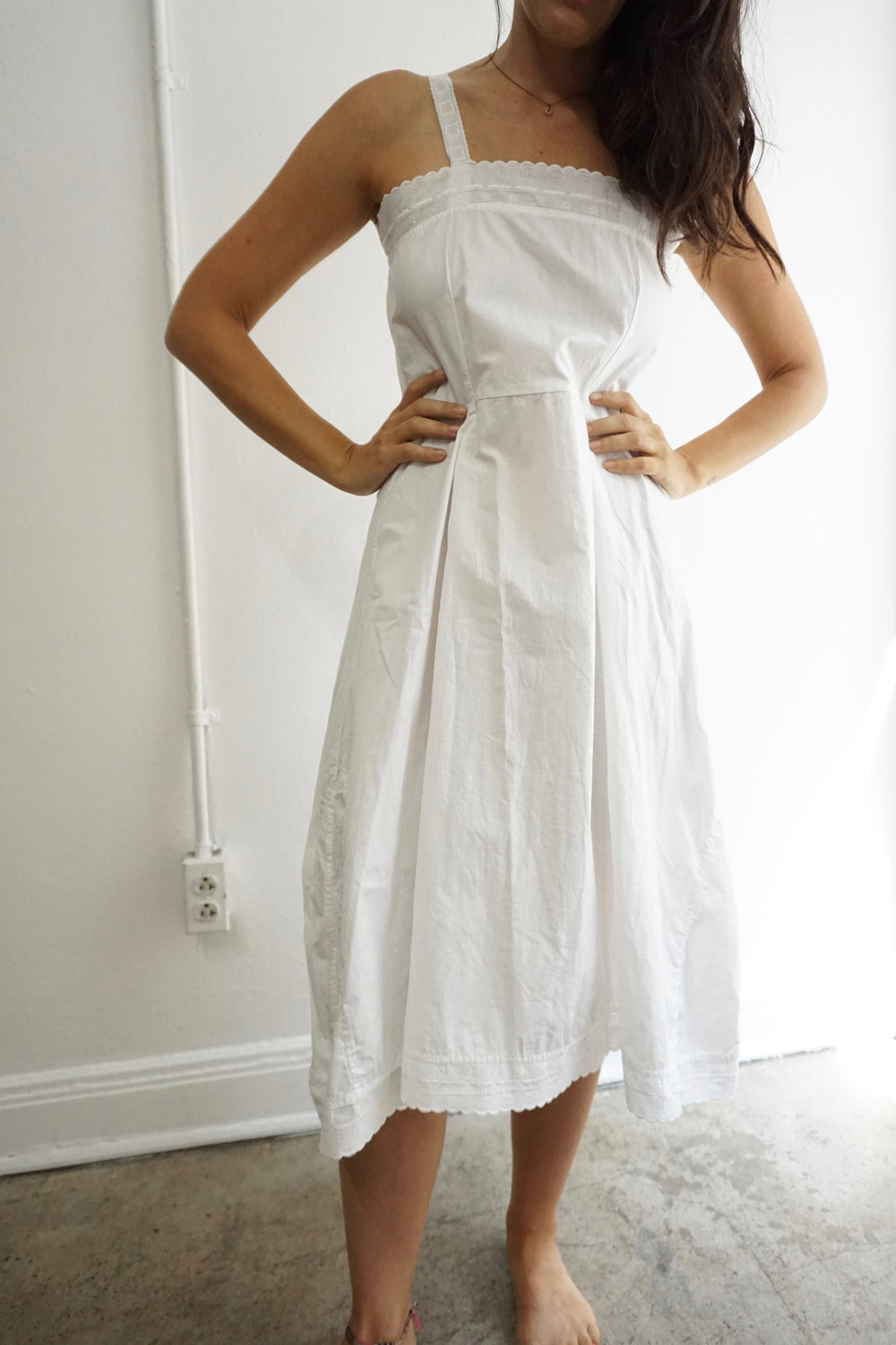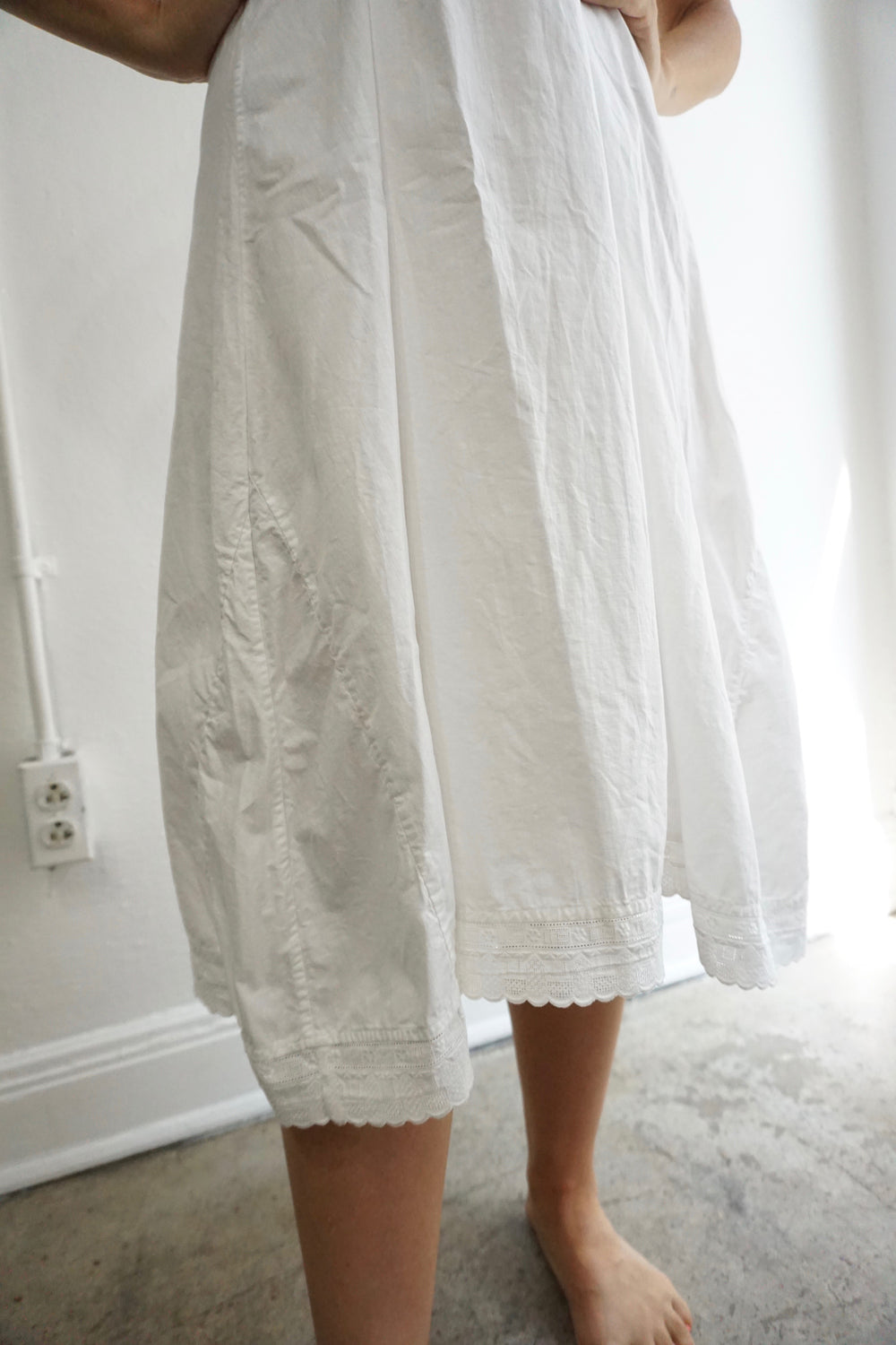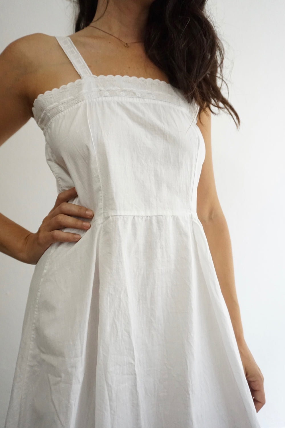 1930s white cotton slip dress. Scalloped trim along neckline & hem. Fitted waist. Bust darts.