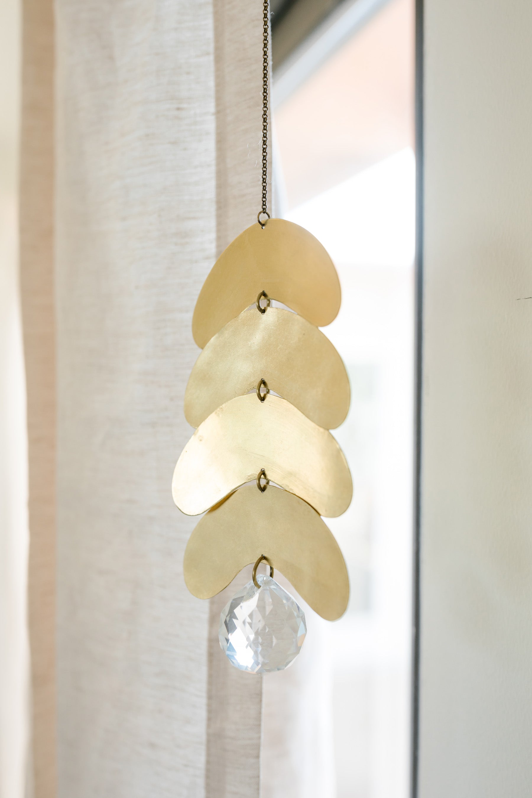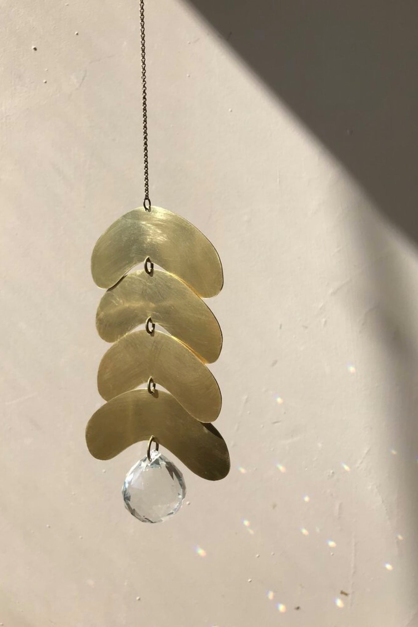 Brass light catcher featuring hand cut shapes from brass sheet + chain. Suspend this from the ceiling (with a ceiling hook) near a window or hanging from your curtain rod to experience the magic of this piece. Handmade in California.