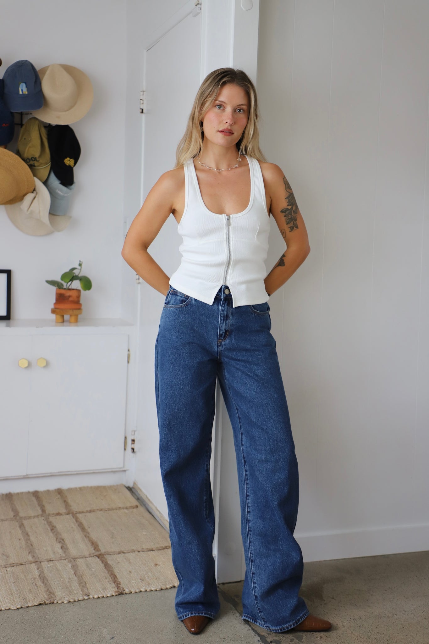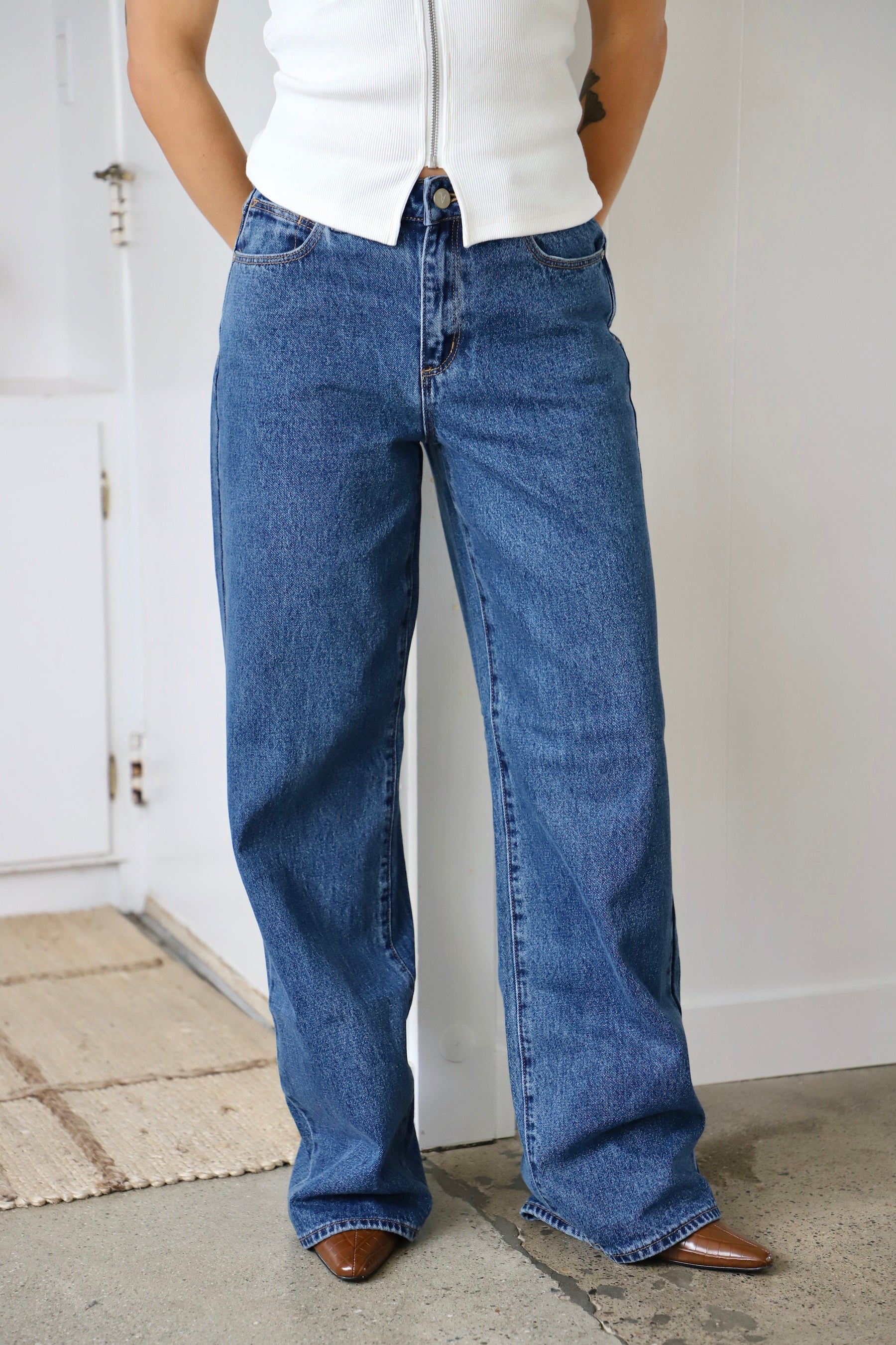 Designed with a mid-rise waist that sits just below your belly button, these jeans are your go-to for a relaxed, baggy style. They feature a comfortable fit through the butt, thighs, and legs, with a wide straight leg that adds to the laid-back '90s style. Made from mid-weight indigo rigid denim, they’ll be snug when you first put them on but will quickly mould to your body shape.