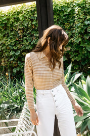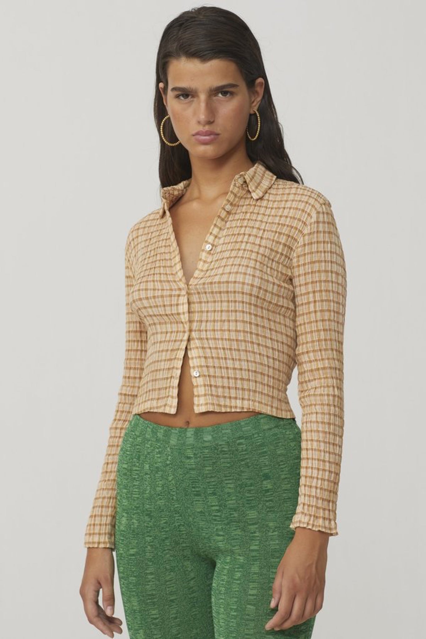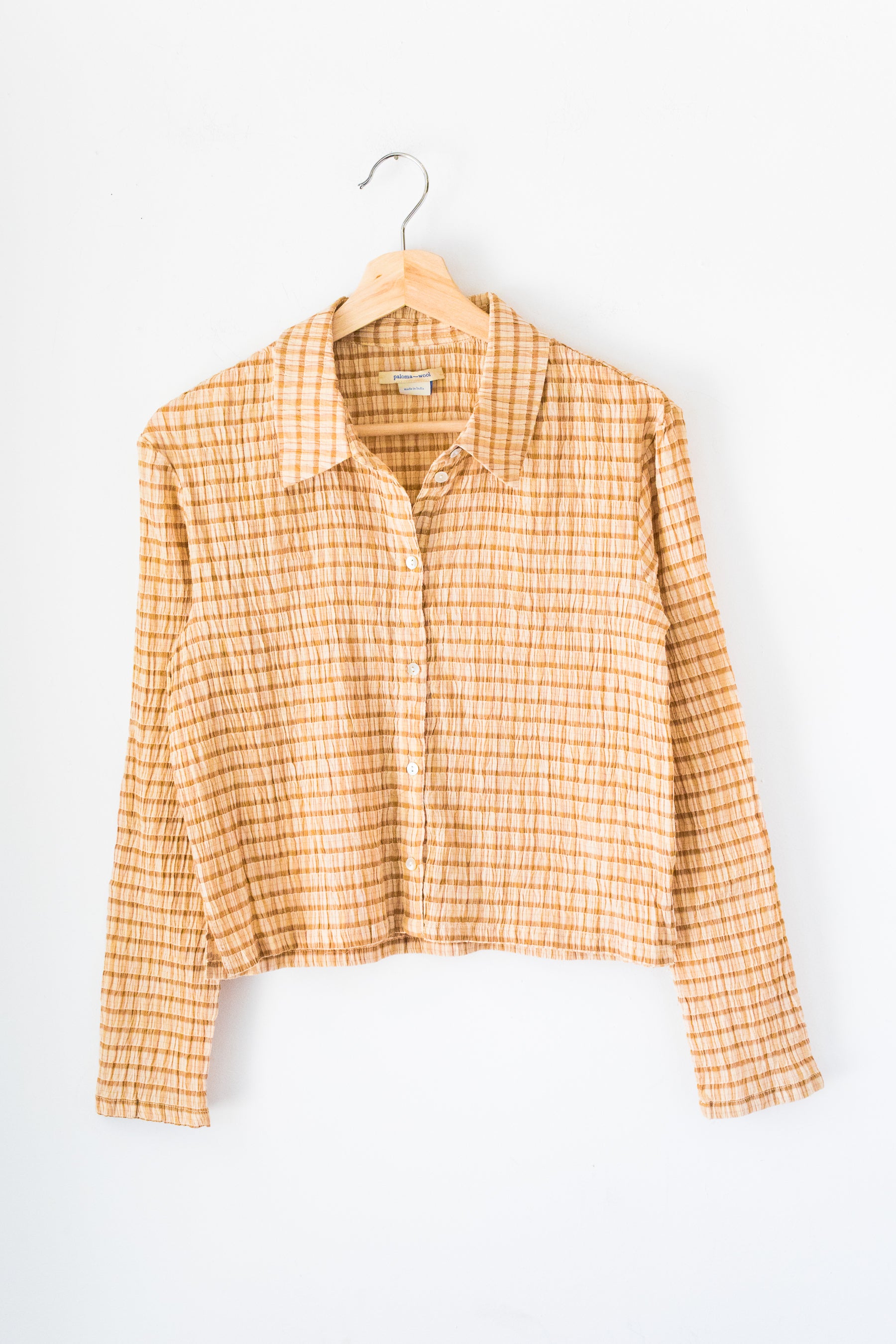 Plaid top featuring a crinkled fabric and mother of pearl buttons.