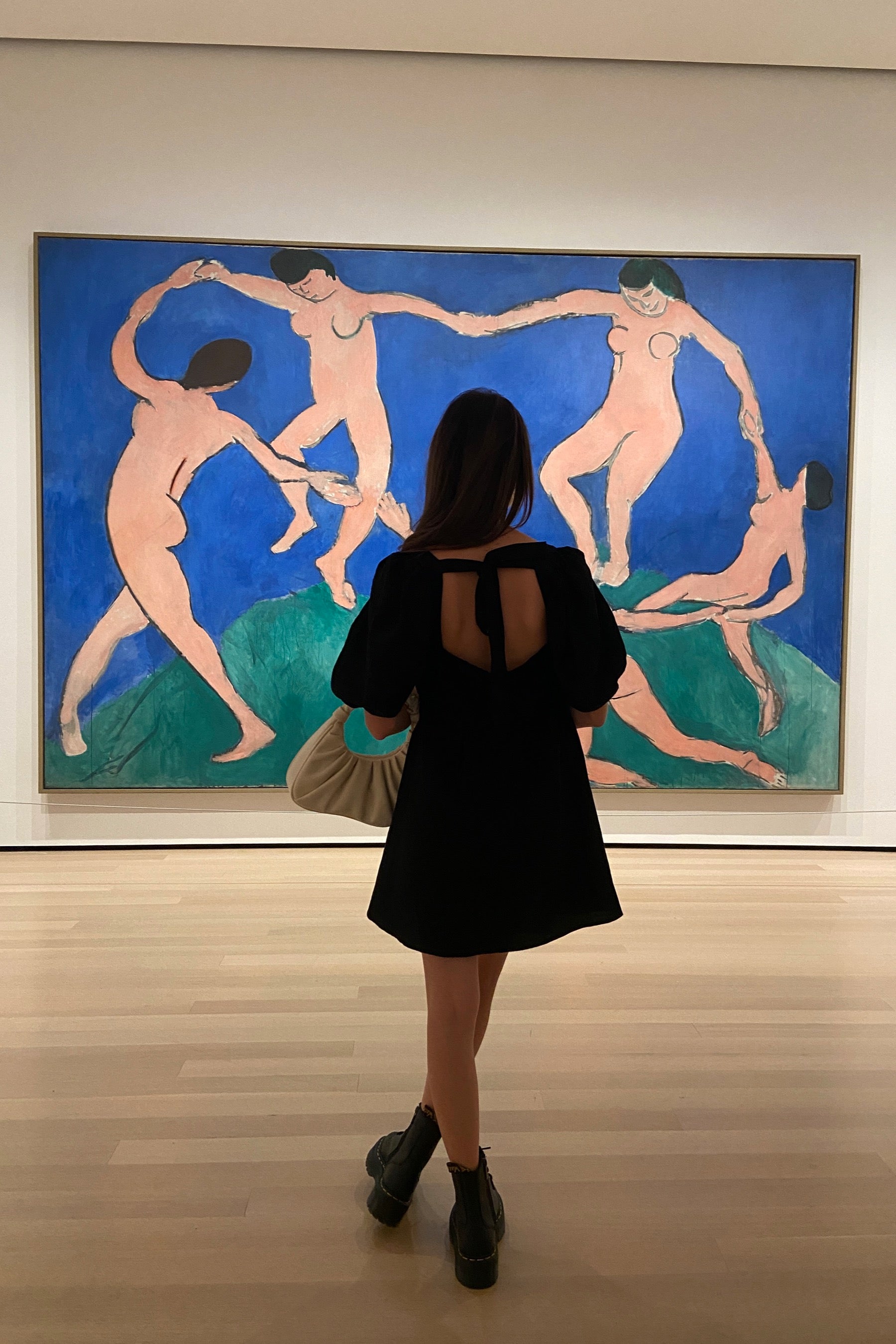 Black babydoll mini dress featuring a puffy short sleeve and open tie back.