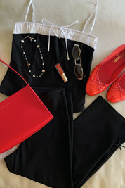 A playful take on a classic silhouette. The Carla Capri is crafted from stretch crepe for a sculpted fit, featuring subtle slits at the hem and delicate satin bow detailing at both leg openings. Finished with an invisible zipper closure for a sleek look.