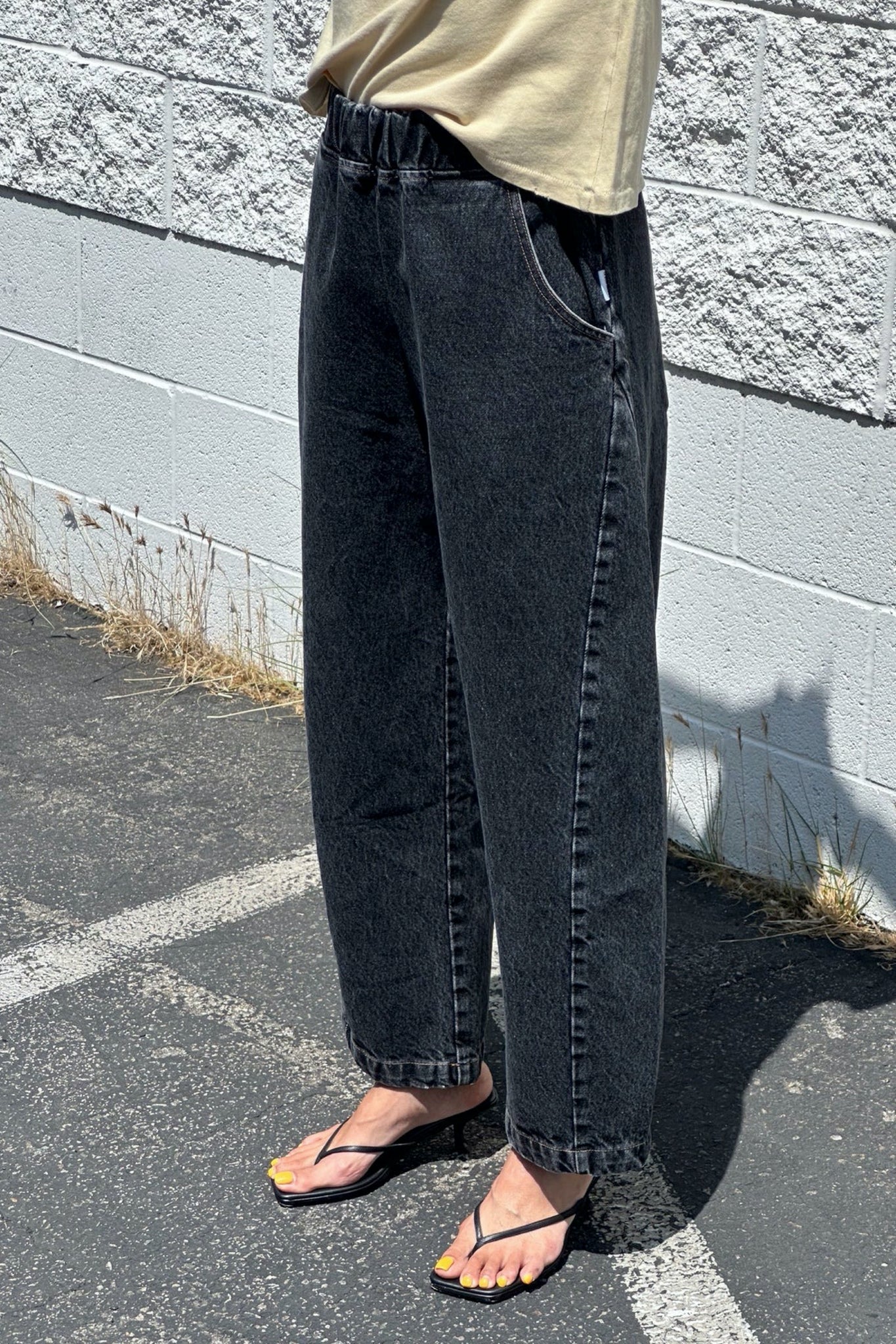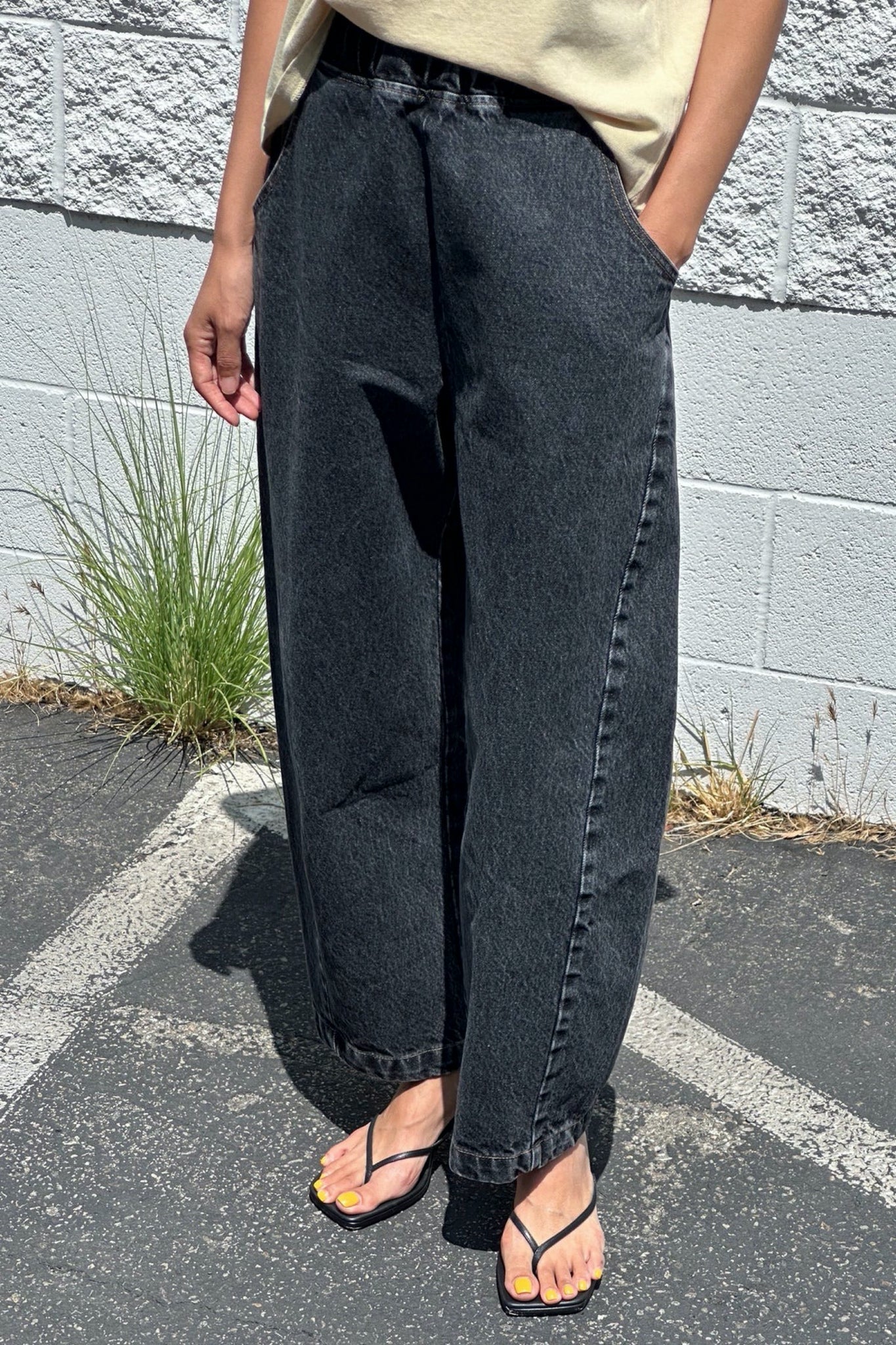 A timeless design featuring an elastic waist tops a slightly curved leg with a unique arced side seam and panels, along with side pockets.