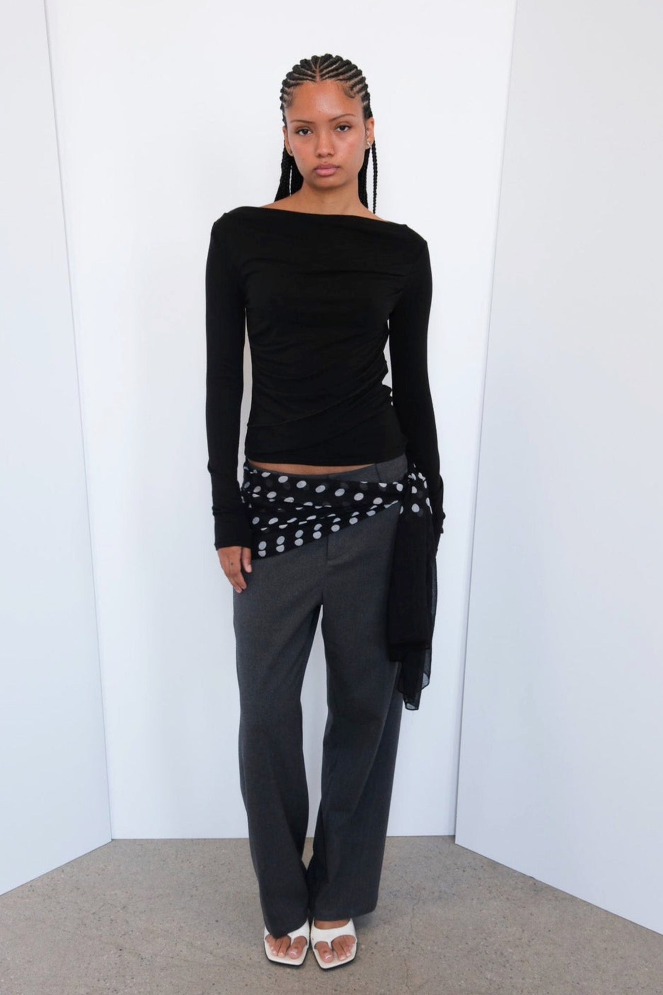 A draped neck long sleeve knit top. Made from a super stretchy semi sheer tencel. Features an asymmetric hem.