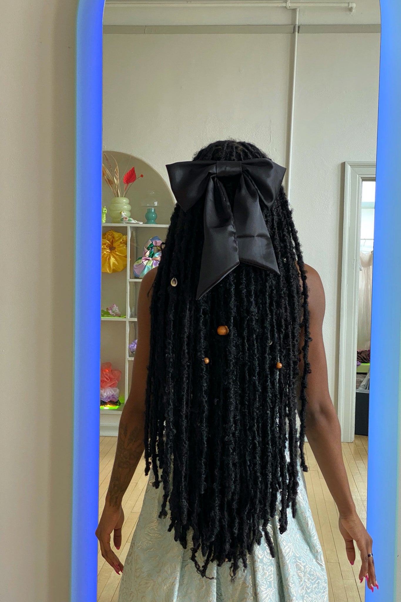 Room Shops best selling giant Bow, now on a scrunchie for more styling options. Looks great with a low pony or high bun also super cute on your wrist. Made in Philadelphia, PA.