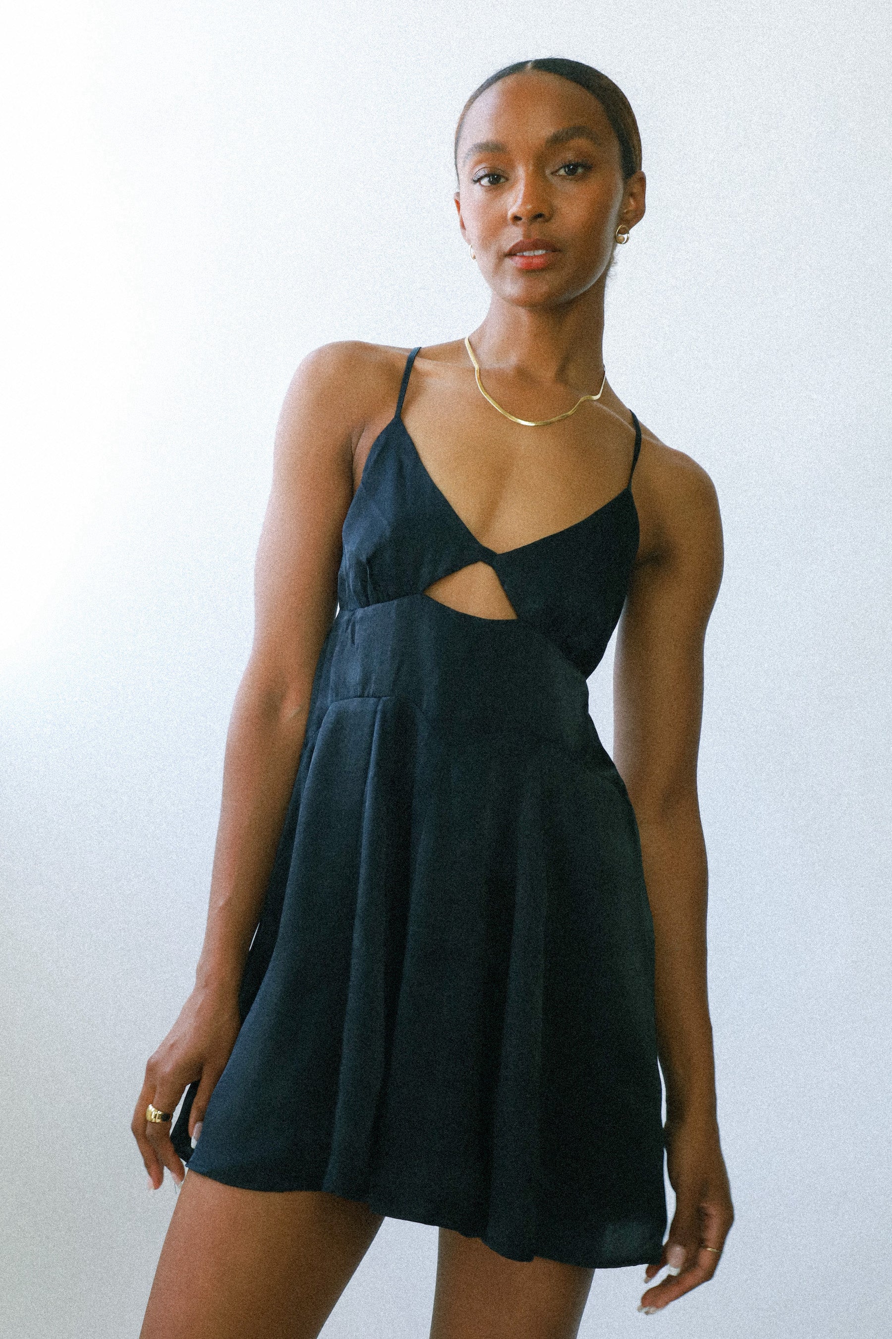 So sweet mini slip featured in a relaxed, billowy fit with a low scoop neckline and thin racerback detailing.