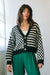 V-neck cardigan featuring an oversized balloon sleeve in a striped check pattern with tortoise buttons.