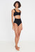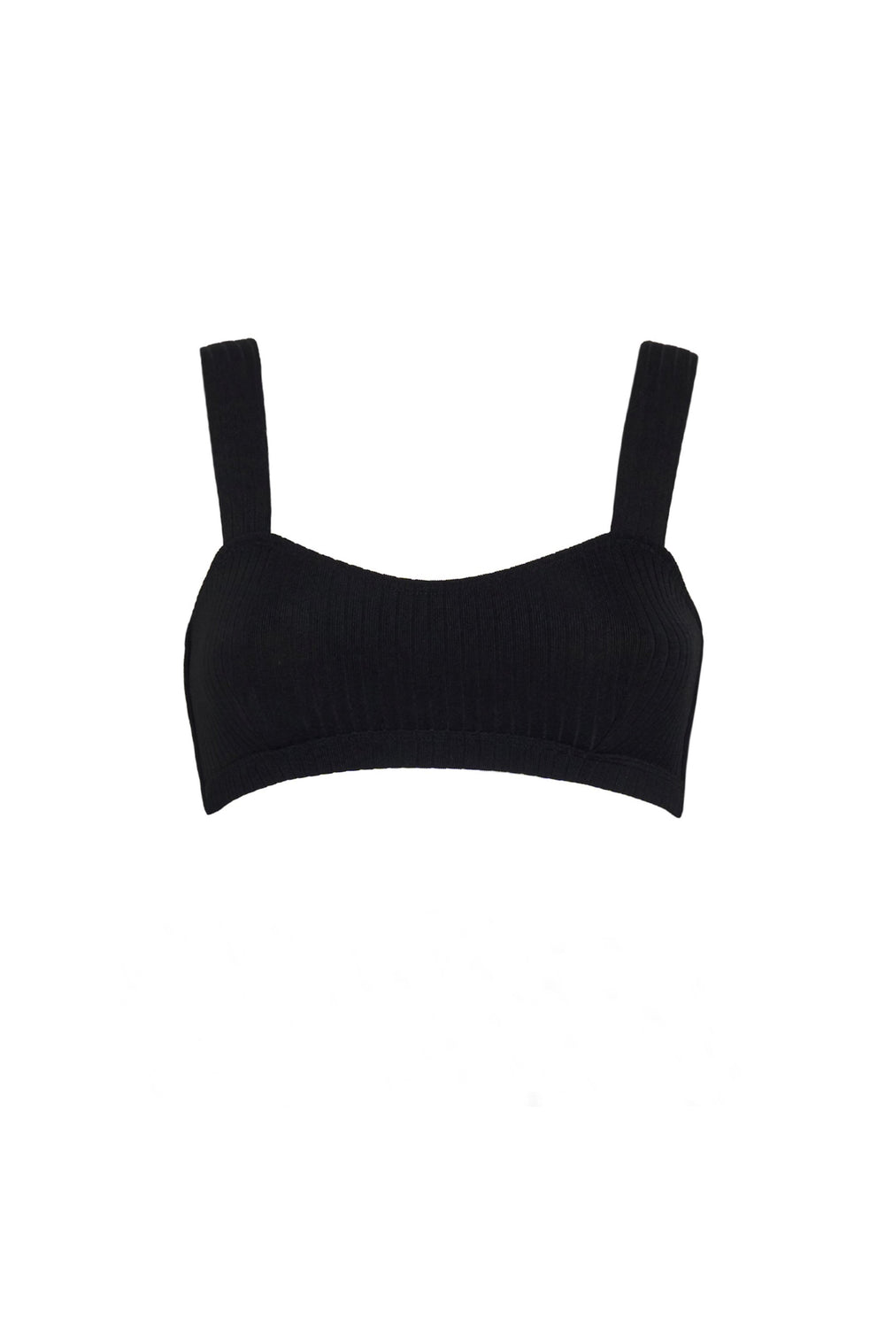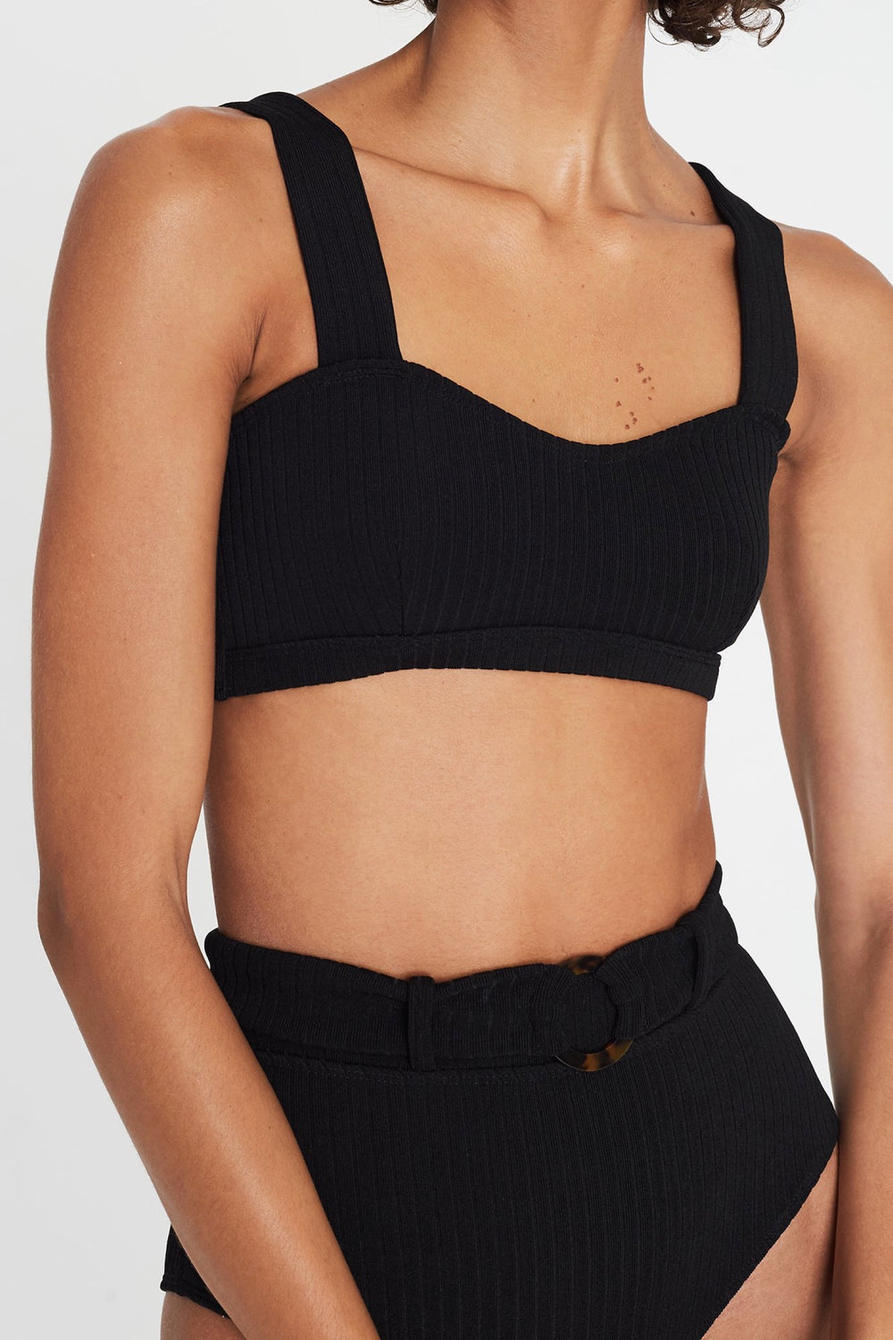 The Provence Top in black ribbing is a fully ribbed, bandeau style bikini top with wide cut, fixed over the shoulder straps and a gold metal clasp to the back. Featuring boning in the sides for extra support, in a luxe stretch ribbing fabrication.