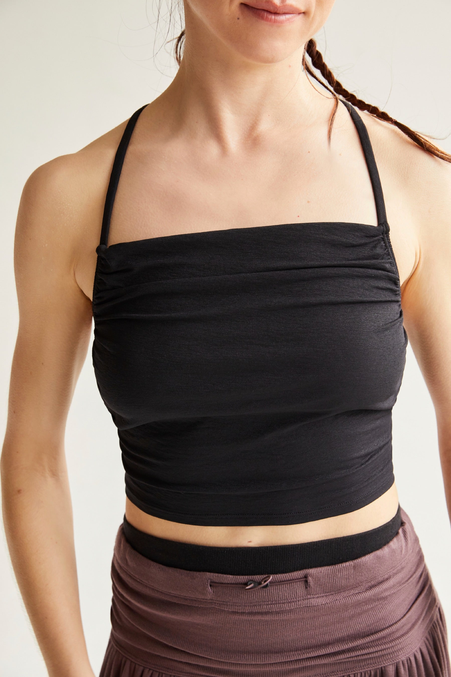 Be workout-ready in this so fun cropped tank featured in a shirred design with a racerback silhouette, cool cutout details and a built-in shelf bra for added support.