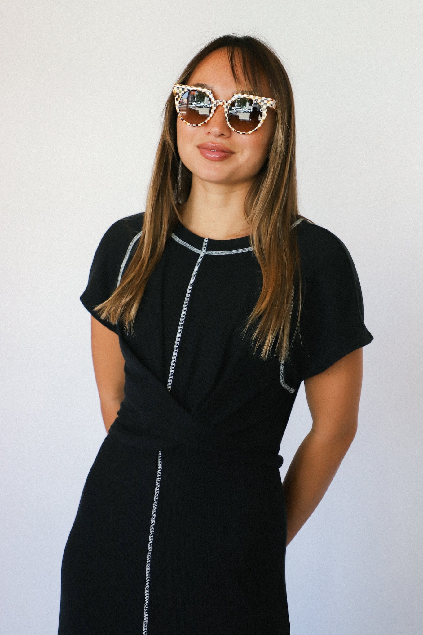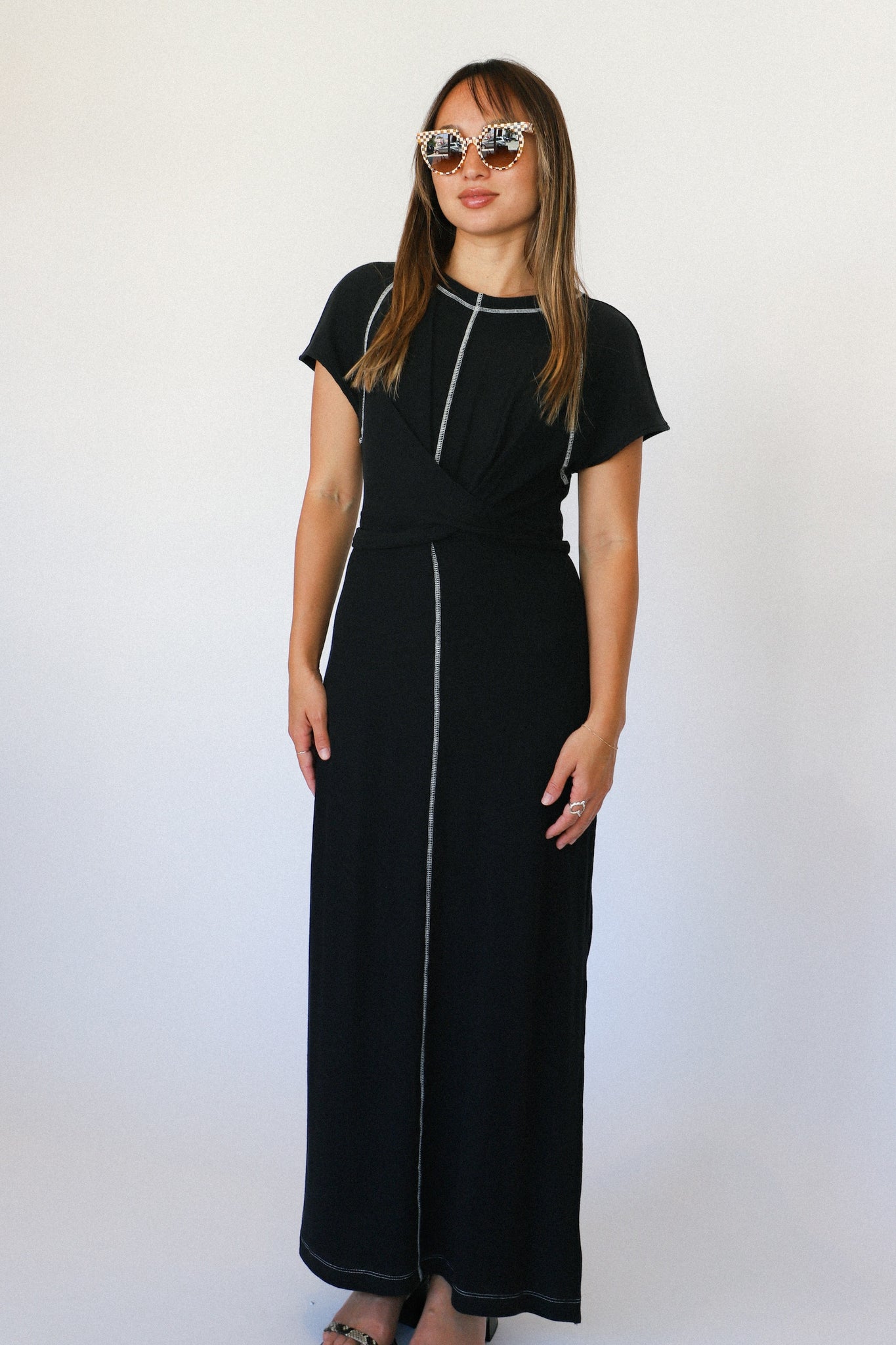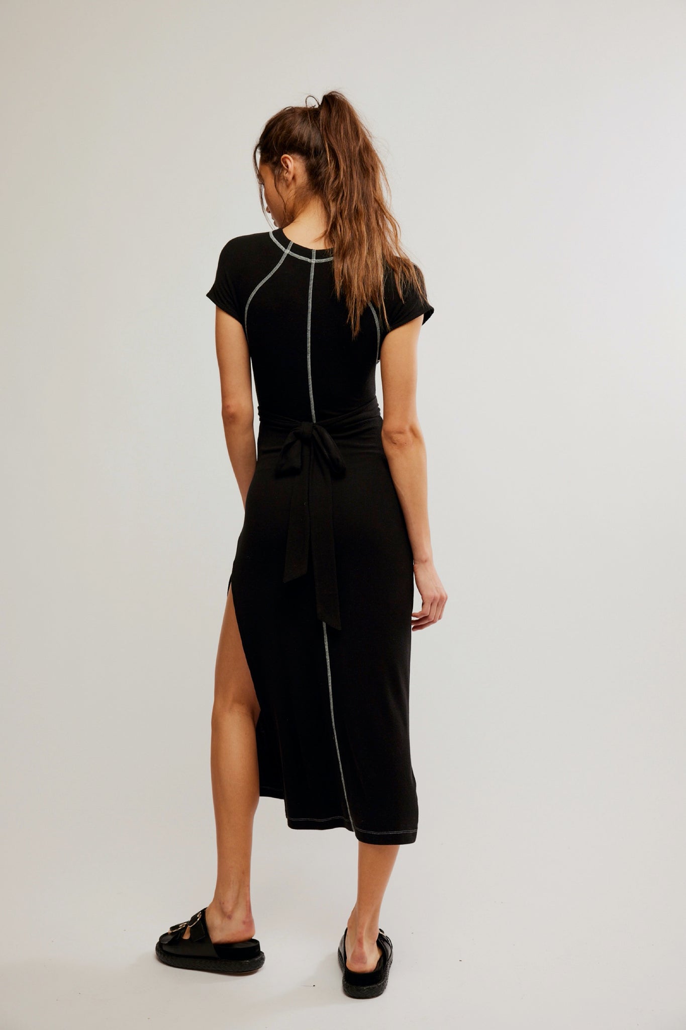 Slip into the sleek and playful Black Sunni Midi Dress. This fitted t-shirt dress features a high slit and playful white contrast stitching. Complete with a tie waist for a flattering silhouette.