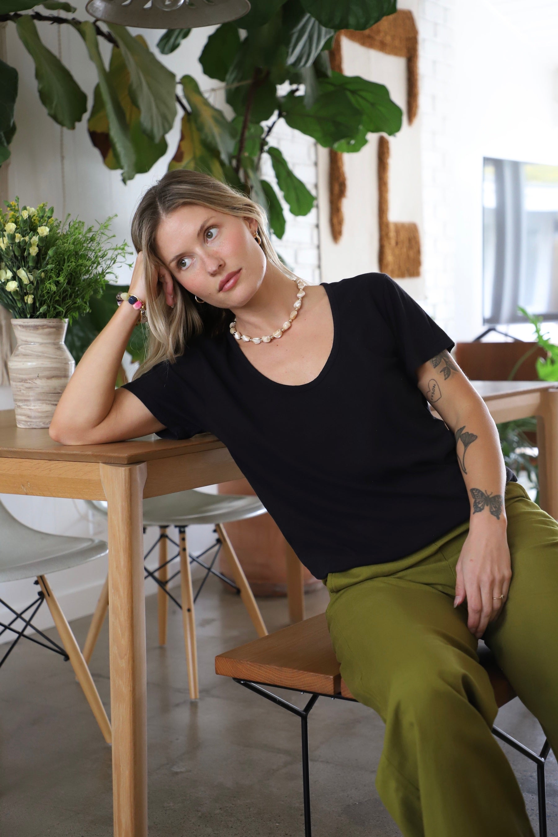 Made from an ultra lightweight, buttery soft hemp blend with a relaxed fit and gently scoop neck.